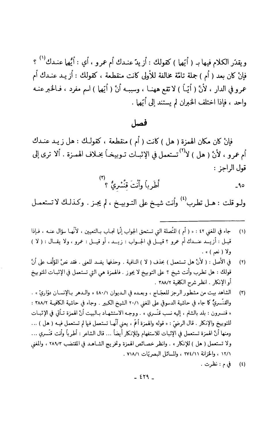 فإنْ كَانَ مَكَان الْهمزَة (هَل) كَانَت (أم) مُنْقَطِعَة كَقَوْلِك هَل زيد عنْدك أم عَمْرو لِأَن (هَل) لَا تسْتَعْمل فِي الْإِثْبَات توبيخاً بِخِلَاف الْهمزَة أَلا ترى إِلَى قَول الراجز 95