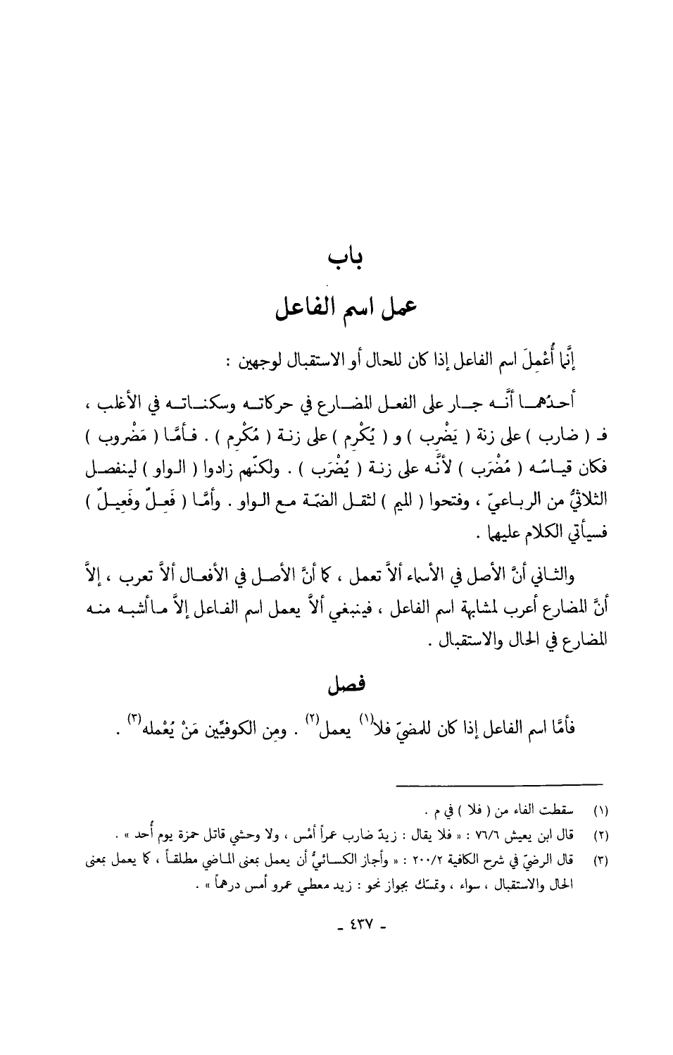 إنَّما أُعملِ اسْم الْفَاعِل إِذا كَانَ للْحَال أَو الِاسْتِقْبَال لوَجْهَيْنِ أحدُهما أنَّه جَار على الْفِعْل الْمُضَارع فِي حركاته وسكناته فِي الْأَغْلَب ف (ضَارب) على زنة (يَضرب) و (يُكرم) على زنة (مُكْرِم) فأمَّا (مُضْرَوب) فَكَانَ قِيَاسه (مضرب) لأنَّه على زنة (يُضرب) ولكنّهم زادوا (الْوَاو) لينفصل الثلاثي من الرباعيّ وفتحوا (الْمِيم) لثقل الضمَّة مَعَ الْوَاو وأمَّا (فعَلُ وفَعيِلٌ) فَسَيَأْتِي الْكَلَام عَلَيْهِمَا وَالثَّانِي أنَّ الأَصْل فِي الْأَسْمَاء ألاَّ تعْمل كَمَا أنَّ الأَصْل فِي الْأَفْعَال ألاَّ تعرب إِلَّا أنًّ الْمُضَارع أعرب لمشابهة اسْم الْفَاعِل فَيَنْبَغِي ألاَّ يعْمل اسْم الْفَاعِل إلاَّ مَا أشبه مِنْهُ الْمُضَارع فِي الْحَال والاستقبال