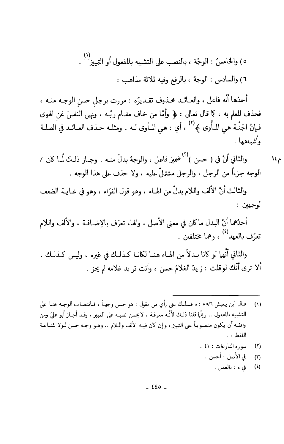 5 -) والخامسُ الوجْهَ بِالنّصب على التَّشْبِيه بالمفعول أَو التَّمْيِيز 6) وَالسَّادِس الوجهُ بِالرَّفْع وَفِيه ثَلَاث مَذَاهِب أحدُها أنَّه فَاعل والعائد مَحْذُوف تقديرهُ مَرَرْت برجلٍ حسنٍ الْوَجْه مِنْهُ فَحذف للْعلم بِهِ كَمَا قَالَ تَعَالَى {وأمَّا من خَافَ مقَام ربِّه وَنهى النفسَ عَنِ الْهوى فإنَّ الجنَّة هِيَ المأْوى} أَي هِيَ المأوى لَهُ وَمثله حذف الْعَائِد فِي الصِّلَة واشباهها وَالثَّانِي أنَّ فِي (حسن) ضمير فَاعل والوجهُ بدلٌ مِنْهُ وَجَاز ذَلِك لماكان الْوَجْه جُزْءا من الرجل وَالرجل مشتملٌ عَلَيْهِ وَلَا حذف على هَذَا الْوَجْه وَالثَّالِث أنَّ الْألف وَاللَّام بدل من الْهَاء وَهُوَ قَول الفرّاء وَهُوَ فِي غَايَة الضعْف لوَجْهَيْنِ أحدُهما أنَّ الْبَدَل مَا كَانَ فِي معنى الأَصْل وَالْهَاء تعرّف بِالْإِضَافَة وَالْألف وَاللَّام تعرّف بالعهد وهما مُخْتَلِفَانِ وَالثَّانِي أنَّهما لَو كَانَا بَدَلا من الْهَاء هُنَا لكانا كَذَلِك فِي غَيره وَلَيْسَ كَذَلِك أَلا ترى أنَّك لَو قلت زيدٌ الْغُلَام حسن وانت تُرِيدُ غُلَامه لم يجز