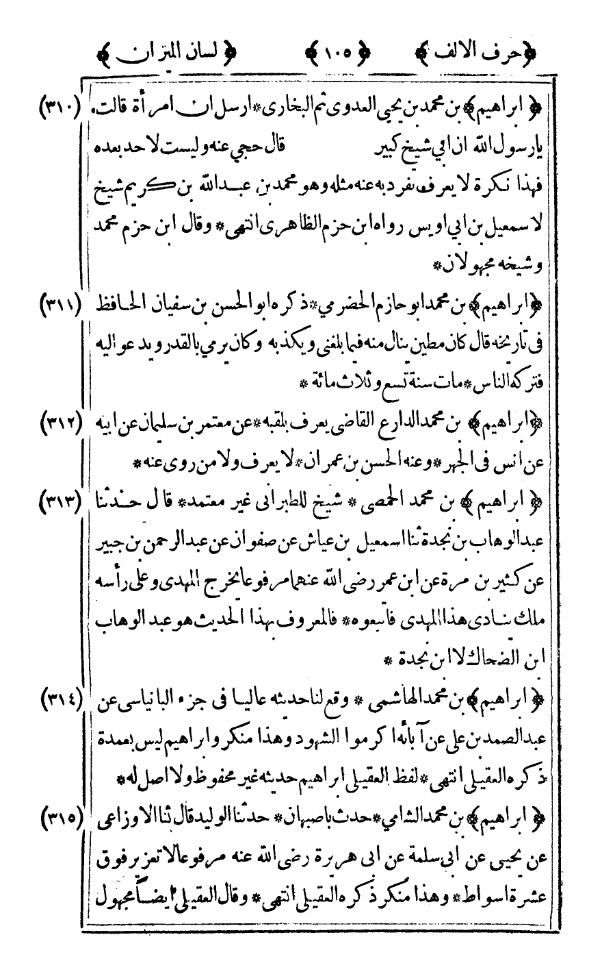[310] "إبراهيم" بن محمد بن يحيى العدوي ثم البخاري أرسل أن امرأة قالت يا رسول الله ان أبي شيخ كبير قال حجي عنه وليست لأحد بعده فهذا نكرة لا يعرف تفرد به عنه مثله وهو محمد بن عبد الله بن كريم شيخ لإسمعيل بن أبي أويس رواه بن حزم الظاهري انتهى وقال ابن حزم محمد وشيخه مجهولان.