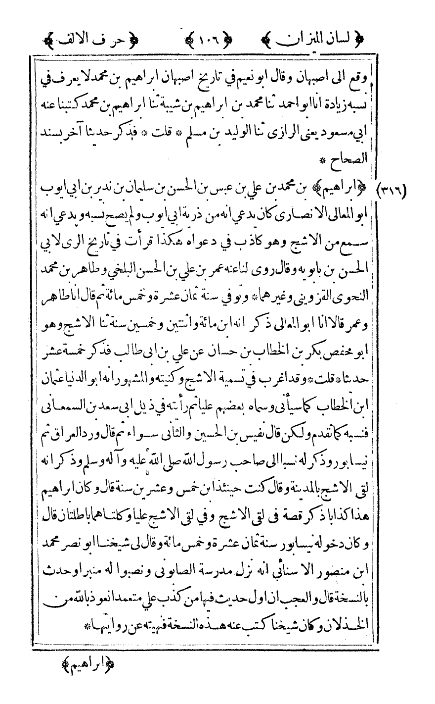 [316] "إبراهيم" بن محمد بن علي بن عبس بن الحسن بن سليمان بن ندير بن أبي أيوب أبو المعالي الأنصاري كان يدعي أنه من ذرية أبي أيوب ولم يصح نسبه ويدعى أنه سمع من الأشج وهو كاذب في دعواه هكذا قرأت في تاريخ الري لأبي الحسن بن بأبويه وقال روى لنا عنه عمر بن علي بن الحسن البلخي وطاهر بن محمد النحوي القزويني وغيرهما وتوفي سنة ثمان عشرة وخمس مائة ثم قال أنا طاهر وعمر قالا أنا أبو المعالي ذكر أنه بن مائة واثنتين وخمسين سنة ثنا الأشج وهو أبو حفص بكر بن الخطاب بن حسان عن علي بن أبي طالب فذكر خمسة عشر حديثا قلت وقد أغرب في تسمية الأشج وكنيته والمشهور أنه أبو الدنيا عثمان بن الخطاب كما سيأتي وسماه بعضهم عليا ثم رأيته في ذيل أبي سعد بن السمعاني فنسبه كما تقدم ولكن قال نفيس بن الحسين والثاني سواء ثم قال ورد العراق ثم نيسابور وذكر له نسبا إلى صاحب رسول الله صلى الله عليه وسلم وذكر أنه لقي الأشج بالمدينة وقال كنت حينئذا بن خمس وعشرين سنة قال وكان إبراهيم هذا كذابا ذكر قصة في لقي الأشج وفي لقي الأشج عليا وكلتاهما باطلتان قال وكان دخوله نيسابور سنة ثمان عشرة وخمس مائة وقال لي شيخنا أبو نصر محمد بن منصور الأسنائي أنه نزل مدرسة الصابوني ونصبوا له منبرا وحدث بالنسخة قال والعجب أن أول حديث فيهما من كذب علي متعمدا نعوذ بالله من الخذلان وكان شيخنا كتب عنه هذه النسخة فنهيته عن روايتها.
