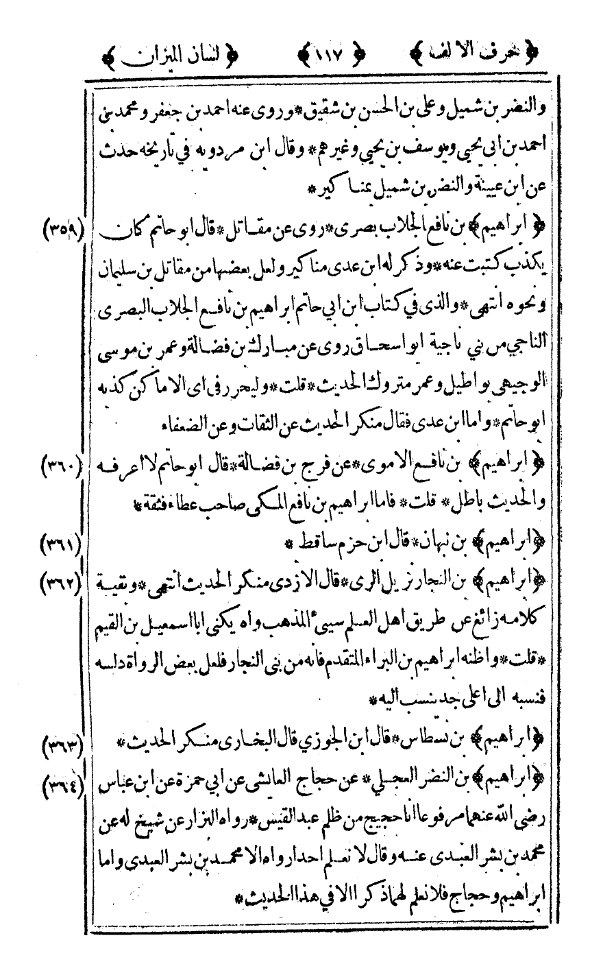 [359] "إبراهيم" بن نافع الجلاب بصري روى عن مقاتل قال أبو حاتم كان يكذب كتبت عنه وذكر له بن علي مناكير ولعل بعضها من مقاتل بن سليمان ونحوه انتهى والذي في كتاب بن أبي حاتم إبراهيم بن نافع الجلاب البصري الناجي من بني ناجية أبو إسحاق روى عن مبارك بن فضالة وعمر بن موسى الوجيهي بواطيل وعمر متروك الحديث قلت وليحرر في أي الأماكن كذبه أبو حاتم وأما بن عدي فقال منكر الحديث عن الثقات وعن الضعفاء.
