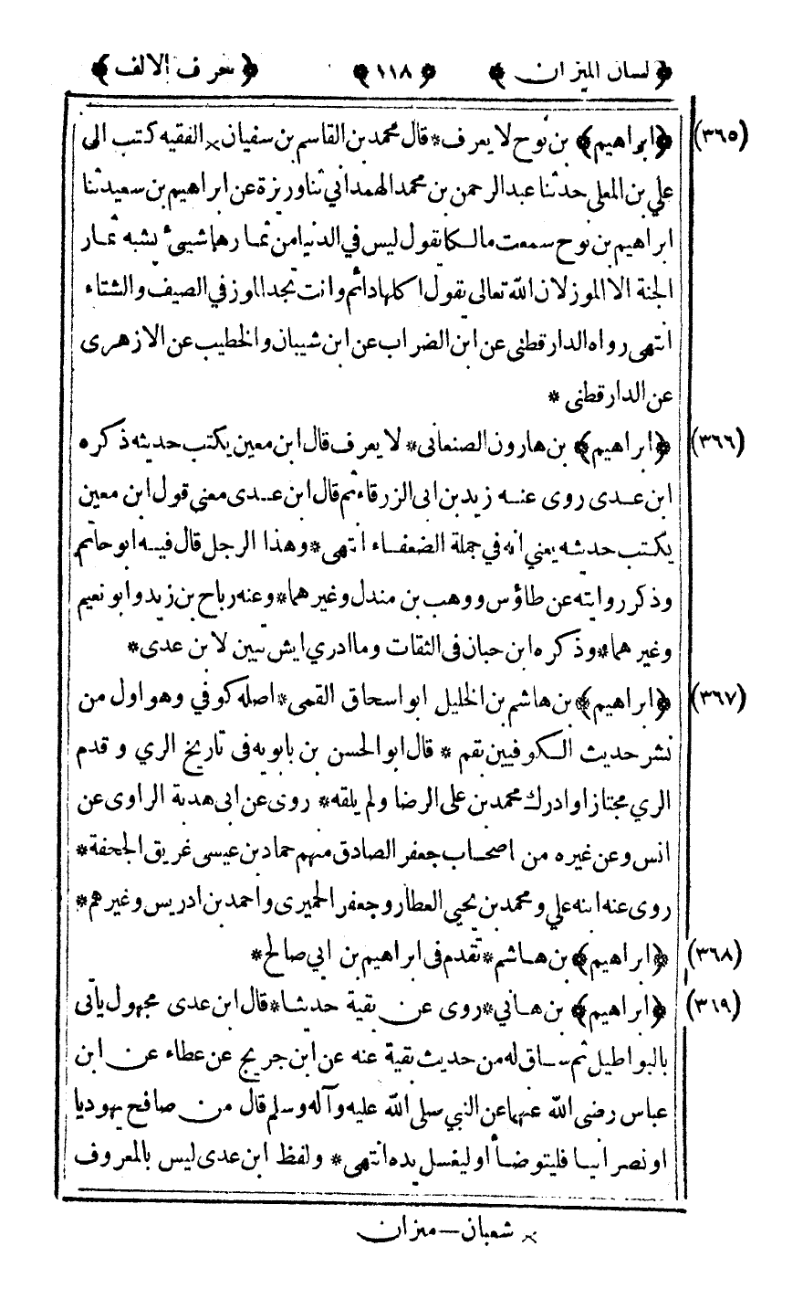 [366] "إبراهيم" بن هارون الصنعاني لا يعرف قال ابن معين يكتب حديثه ذكره ابن عدي روى عنه زيد بن أبي الزرقاء ثم قال ابن عدي معنى قول بن معين يكتب حديثه يعني أنه في جملة الضعفاء انتهى وهذا الرجل قال فيه أبو حاتم وذكر روايته عن طاوس ووهب بن مندل وغيرهما وعنه رباح بن زيد وأبو نعيم وغيرهما وذكره ابن حبان في الثقات وما أدري أيش تبين لابن عدي.
