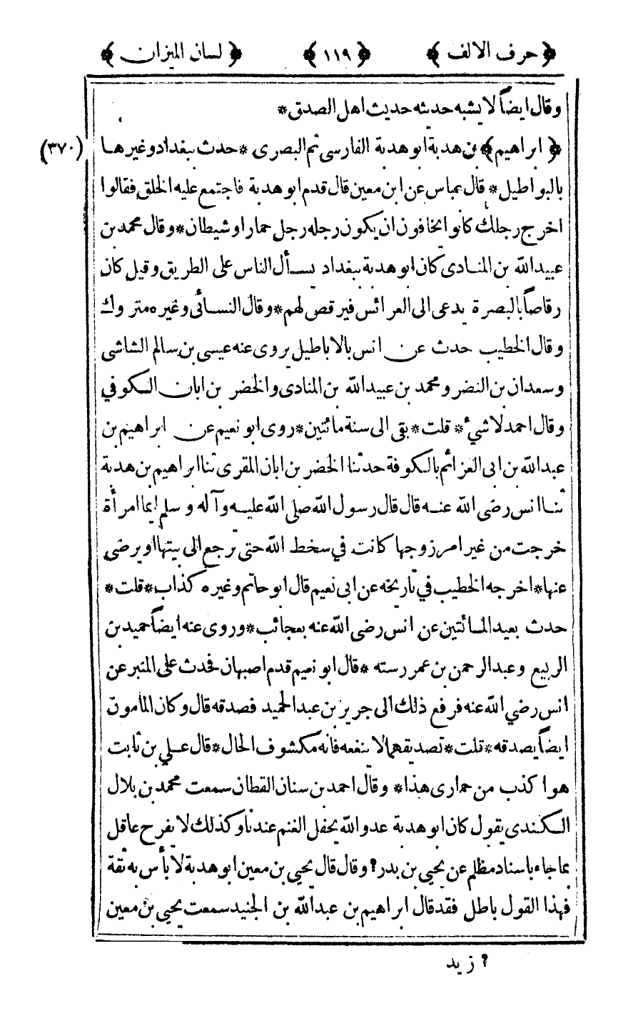 [370] "إبراهيم" بن هدبة أبو هدبة الفارسي ثم البصري حدث ببغداد وغيرهما بالبواطيل قال عباس عن ابن معين قال قدم أبو هدبة فاجتمع عليه الخلق فقالوا اخرج رجلك كانوا يخافون أن يكون رجله رجال حمار أو شيطان وقال محمد بن عبيد الله بن المنادى كان أبو هدبة ببغداد يسأل الناس على الطريق وقيل كان رقاصا بالبصرة يدعى إلى العرائس فيرقص لهم وقال النسائي وغير متروك وقال الخطيب حدث عن أنس بالأباطيل يروي عنه عيسى بن سالم الشاشي وسعدان بن النضر ومحمد بن عبيد الله بن المنادي والخضر بن أبان الكوفي وقال أحمد لا شيء قلت بقي إلى سنة مائتين روى أبو نعيم عن إبراهيم بن عبد الله بن أبي العزائم بالكوفة حدثنا الخضر بن أبان المقري ثنا إبراهيم بن هدبة ثنا أنس رضى الله تعالى عنه قال قال رسول الله صلى الله عليه وسلم: "أيما امرأة خرجت من غير أمر زوجها كانت في سخط الله حتى ترجع إلى بيتها أو يرضى عنها" أخرجه الخطيب في تاريخه عن أبي نعيم قال أبو حاتم وغيره كذاب قلت حدث بعيد المائتين عن أنس رضى الله تعالى عنه بعجائب وروى عنه أيضا حميد بن الربيع وعبد الرحمن بن عمر رسته قال أبو نعيم قدم أصبهان فحدث على المنبر عن أنس رضى الله تعالى عنه فرفع ذلك إلى جرير بن عبد الحميد فصدقه قال وكان المأمون أيضا يصدقه قلت تصديقهما لا ينفعه فإنه مكشوف الحال قال علي بن ثابت هو أكذب من حماري هذا وقال أحمد بن سنان القطان سمعت محمد بن بلال الكندي يقول كان أبو هدبة عدو الله يحفل الغنم عندنا وكذلك لا يفرح عاقل بما جاء بإسناد مظلم عن يحيى بن بدر وقال قال يحيى بن معين أبو هدبة لا بأس به ثقة فهذا القول باطل فقد قال إبراهيم بن عبد الله بن الجنيد سمعت يحيى بن معين