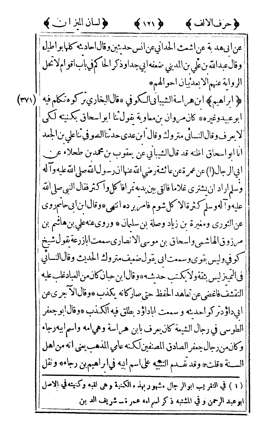 [371] "إبراهيم" بن هراسة الشيباني الكوفي قال البخاري تركوه تكلم فيه أبو عبيد وغيره كان مروان بن معاوية يقول ثنا أبو إسحاق بكنيته لكي لا يعرف وقال النسائي متروك وقال ابن عدي حدثنا الصوفي ثنا علي بن الجعد أنا أبو إسحاق أظنه قد قال الشيباني عن يعقوب بن محمد بن طحلاء عن أبي الرجال1 عن عمرة عن عائشة رضى الله تعالى عنها أن رسول الله صلى الله عليه وسلم أراد أن يشتري غلاما فألقى بين يديه تمرا فأكل وأكثر فقال النبي صلى الله عليه وسلم: "كثرة الأكل شوم" فأمر برده انتهى وقال ابن أبي حاتم روى عن الثوري ومغيرة بن زياد وصلة بن سليمان وروى عنه علي بن هاشم بن مروزق الهاشمي وإسحاق بن موسى الأنصاري سمعت أبا زرعة يقول شيخ كوفي وليس بقوي وسمعت أبي يقول ضعيف متروك الحديث وقال النسائي في التمييز ليس بثقة ولا يكتب حديثه وقال ابن حبان كان من العباد غلب عليه التقشف فأغضى عن تعاهد الحفظ حتى صار كأنه يكذب وقال الآجري عن أبي داود تركوا حديثه وسمعت أبا داود يطلق فيه الكذب وقال أبو جعفر الطوسي في رجال الشيعة كان يعرف بابن هراسة وهي أمه واسم أبيه رجاء وكان من رجال جعفر الصادق المصنفين لكنه عامي المذهب يعني أنه من أهل السنة قلت وقد تقدم التنبيه على اسم أبيه في إبراهيم بن رجاء ونقل