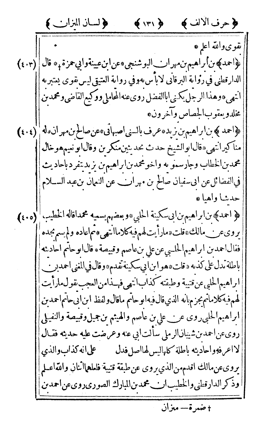 [403] "أحمد" بن إبراهيم بن مهران البوشنجي عن ابن عيينة وأبي حمزة قال الدارقطني في رواية البرقاني لا بأس به وفي رواية العتيقي ليس بقوي يعتبر به انتهى وهذا الرجل يكنى أبا الفضل روى عنه المحاملي ووكيع القاضي ومحمد بن مخلد ويعقوب الجصاص وآخرون.