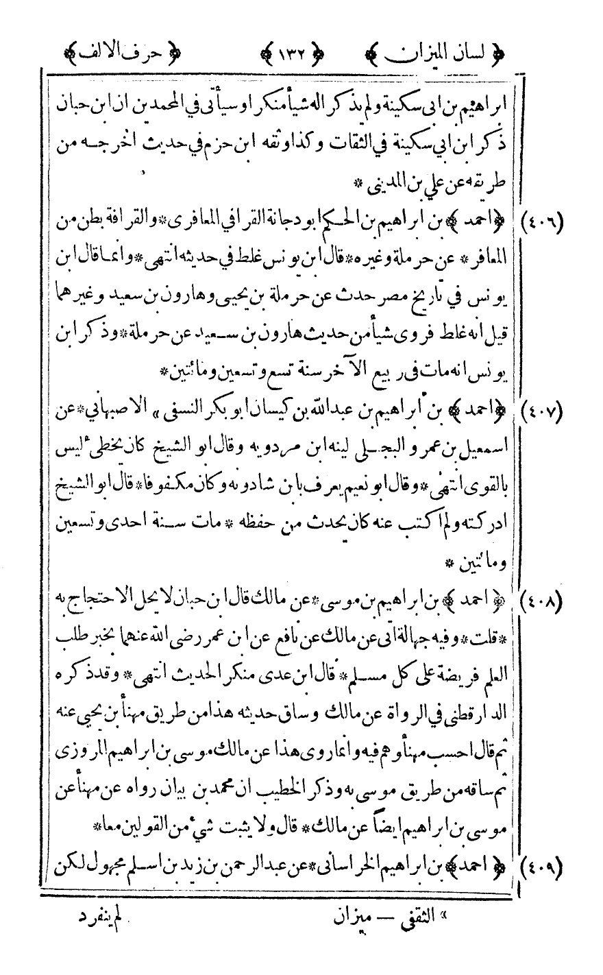 [407] "أحمد" بن إبراهيم بن عبد الله بن كيسان أبو بكر النسفي الأصبهاني عن إسماعيل بن عمرو البجلي لينه بن مردويه وقال أبو الشيخ كان يخطىء ليس بالقوي انتهى وقال أبو نعيم يعرف بابن شادونه وكان مكفوفا قال أبو الشيخ أدركته ولم أكتب عنه كان يحدث من حفظه مات سنة إحدى وتسعين ومائتين.