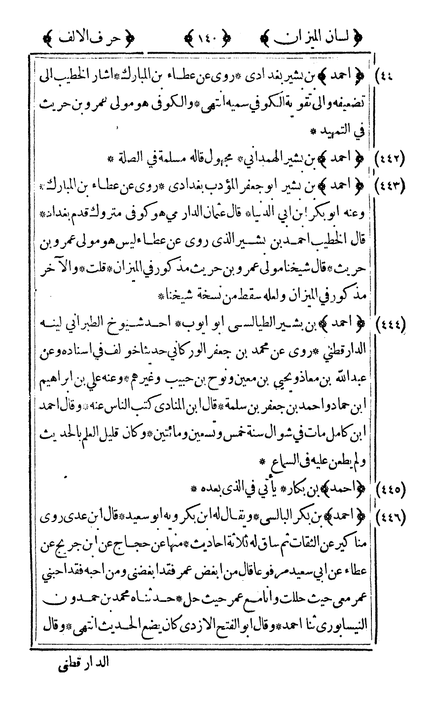 [443] "أحمد" بن بشير أبو جعفر المؤدب بغدادي روى عن عطاء بن المبارك وعنه أبو بكر بن أبي الدنيا قال عثمان الدارمي هو كوفي متروك قدم بغداد قال الخطيب أحمد بن بشير الذي روى عن عطاء ليس هو مولى عمرو بن حريث قال شيخنا مولى عمرو بن حريث مذكور في الميزان قلت والآخر مذكور في الميزان ولعله سقط من نسخة شيخنا.