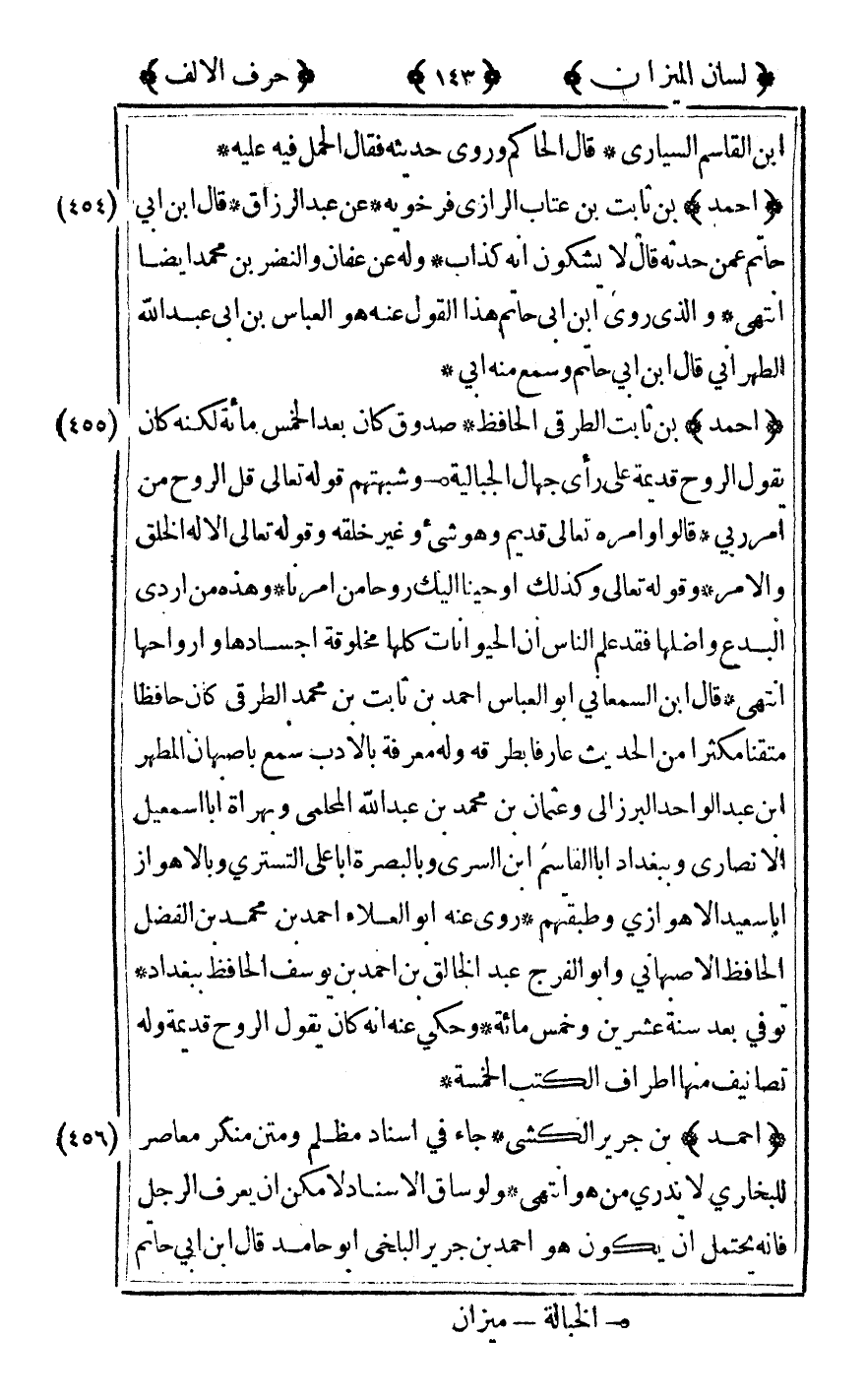 [455] "أحمد" بن ثابت الطرقي الحافظ صدوق كان بعد الخمس مائة لكنه كان يقول الروح قديمة على رأي جهال الجبالية وشبهتهم قوله تعالى: " قُلِ الرُّوحُ مِنْ أَمْرِ رَبِّي" قالوا أو وأمره تعالى قديم وهو شيء وغير خلقه وقوله تعالى: "أَلَا لَهُ الْخَلْقٌ وَالْأَمْر" وقوله تعالى: "وَكَذَلِكَ أَوْحَيْنَا إِلَيْكَ رُوحًا مِنْ أَمْرِنَا" وهذه من أردى البدع وأضلها فقد علم الناس أن الحيوانات كلها مخلوقة أجسادها وأرواحها انتهى قال ابن السمعاني أبو العباس أحمد بن ثابت بن محمد الطرقي كان حافظا متقنا مكثرا من الحديث عارفا بطرقه وله معرفة بالأدب سمع بأصبهان المطهر بن عبد الواحد البرزالي وعثمان بن محمد بن عبد الله المحملي وبهراة أبا إسماعيل الأنصاري وببغداد أبا القاسم بن السري وبالبصرة أبا علي التستري وبالأهواز أبا سعيد الأهوازي وطبقتهم روى عنه أبو العلاء أحمد بن محمد بن الفضل الحافظ الأصبهاني وأبو الفرج عبد الخالق بن أحمد بن يوسف الحافظ ببغداد توفي بعد سنة عشرين وخمس مائة وحكي عنه أنه كان يقول الروح قديمة وله تصانيف منها أطراف الكتب الخمسة.