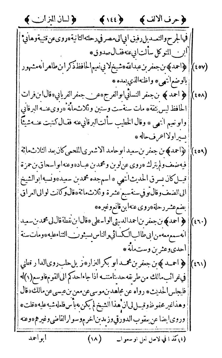 [457] "أحمد" بن جعفر بن عبد الله شيخ لأبي نعيم الحافظ ذكر بن طاهر أنه مشهور بالوضع انتهى وأظنه الذي بعده.