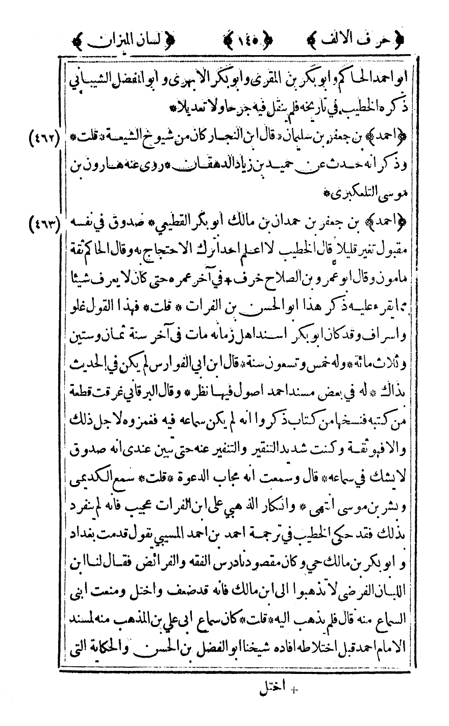 [462] "أحمد" بن جعفر بن سليمان قال ابن النجار كان من شيوخ الشيعة قلت وذكر أنه حدث عن حميد بن زياد الدهقان روى عنه هارون بن موسى التلعكبري.