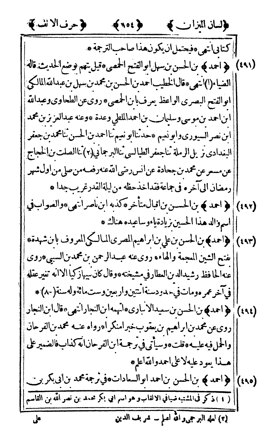[492] "أحمد" بن الحسن بن إقبال متأخر كذبه بن ناصر انتهى والصواب في اسم والد هذا الحسين بزيادة ياء وساعيده هناك.
