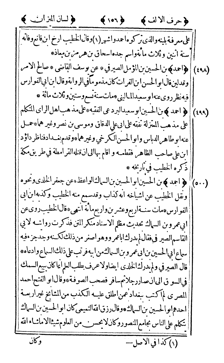 [498] "أحمد" بن الحسين بن المؤمل الصيرفي عن يوسف القاضي صالح الأمر وقد لين قال أبو الحسن بن الفرات كان مذموما في الرواية وقال ابن أبي الفوارس فيه نظر روى عنه أبو سعيد الماليني مات سنة تسع وستين وثلاث مائة.