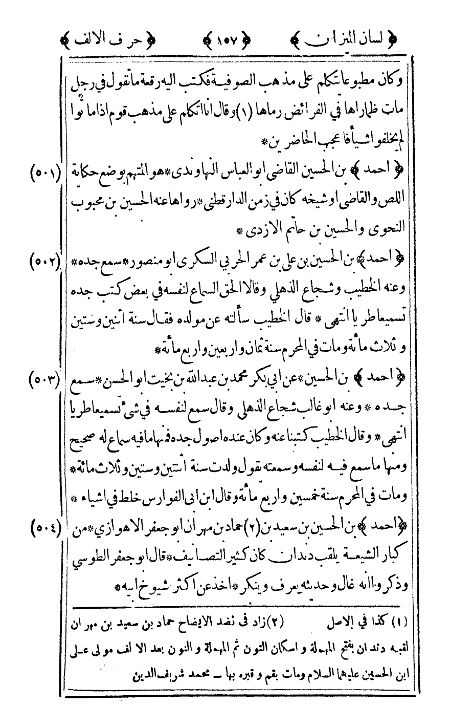 [504] "أحمد" بن الحسين بن سعيد بن2 حماد بن مهران أبو جعفر الأهوازي من كبار الشيعة يلقب دندان كان كثير التصانيف قال أبو جعفر الطوسي وذكروا أنه غال وحديثه يعرف وينكر أخذ عن أكثر شيوخ أبيه.