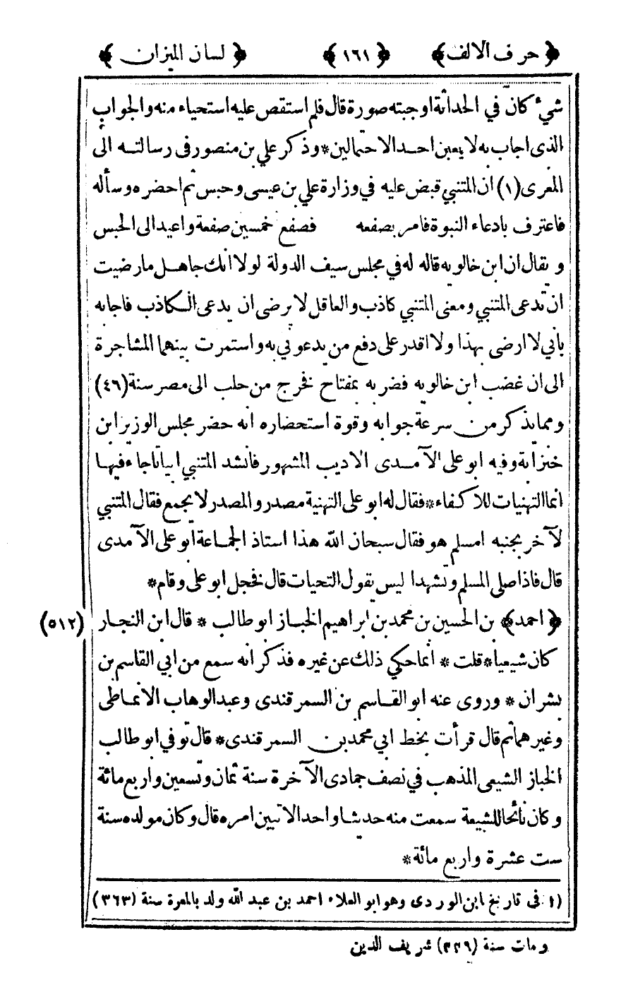 [512] "أحمد" بن الحسين بن محمد بن إبراهيم الخباز أبو طالب قال ابن النجار كان شيعيا قلت إنما حكي ذلك عن غيره فذكر أنه سمع من أبي القاسم بن بشران وروى عنه أبو القاسم بن السمرقندي وعبد الوهاب الأنماطي وغيرهما ثم قال قرأت بخط أبي محمد بن السمرقندي قال توفي أبو طالب الخباز الشيعي المذهب في نصف جمادي الآخرة سنة ثمان وتسعين وأربع مائة وكان نائحا للشيعة سمعت منه حديثا واحد لأتبين أمره قال وكان مولده سنة ست عشرة وأربع مائة.