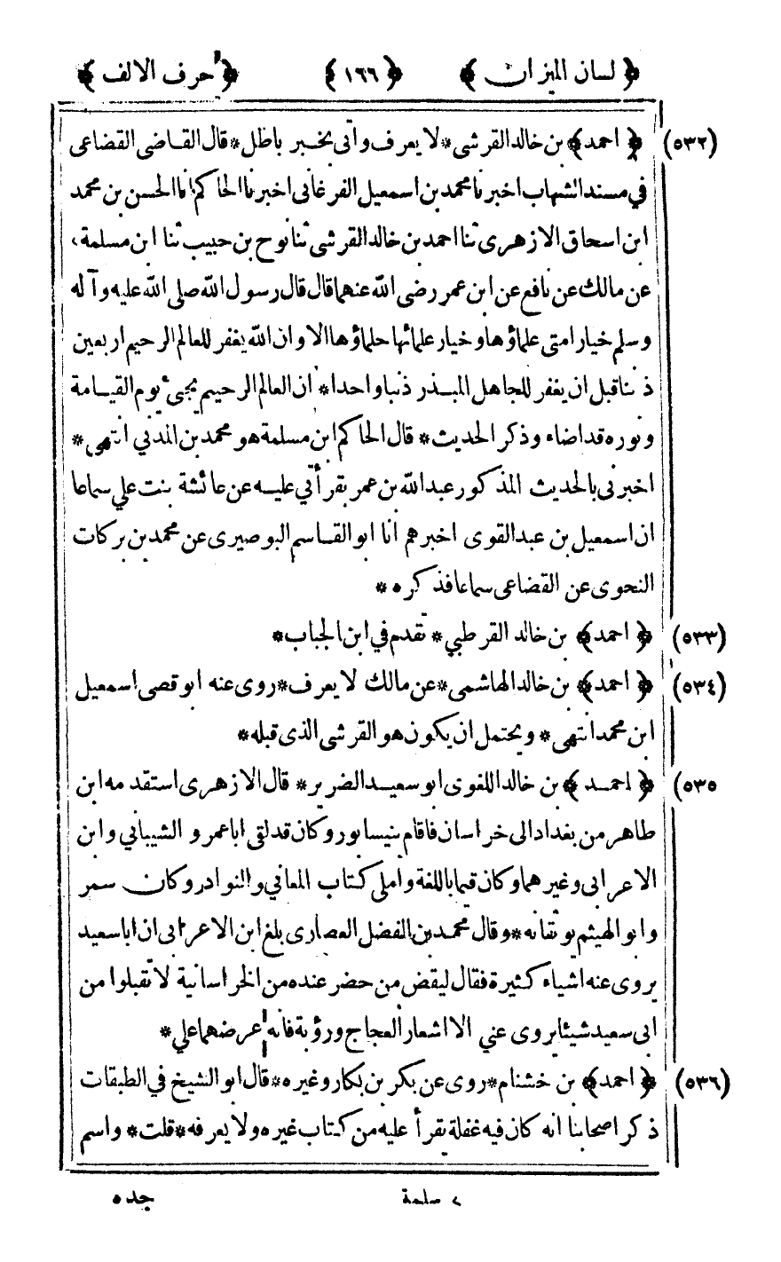 [532] "أحمد" بن خالد القرشي لا يعرف وأتى بخبر باطل قال القاضي القضاعي في مسند الشهاب أخبرنا محمد بن إسماعيل الفرغاني أخبرنا الحاكم أنا الحسن بن محمد بن إسحاق الأزهري ثنا أحمد بن خالد القرشي ثنا نوح بن حبيب ثنا بن مسلمة عن مالك عن نافع عن ابن عمر رضى الله تعالى عنهما قال قال رسول الله صلى الله عليه وسلم: "خيار أمتى علماؤها وخيار علمائها حلماؤها الا وأن الله يغفر للعالم الرحيم أربعين ذنبا قبل أن يغفر للجاهل المبذر ذنبا واحدا أن العالم الرحيم يجيء يوم القيامة ونوره قد أضاء" وذكر الحديث قال الحاكم بن مسلمة هو محمد بن المدني انتهى أخبرني بالحديث المذكور عبد الله بن عمر بقرأتي عليه عن عائشة بنت علي سماعا إن إسماعيل بن عبد القوي أخبرهم أنا أبو القاسم البوصيري عن محمد بن بركات النحوي عن القضاعي سماعا فذكره.