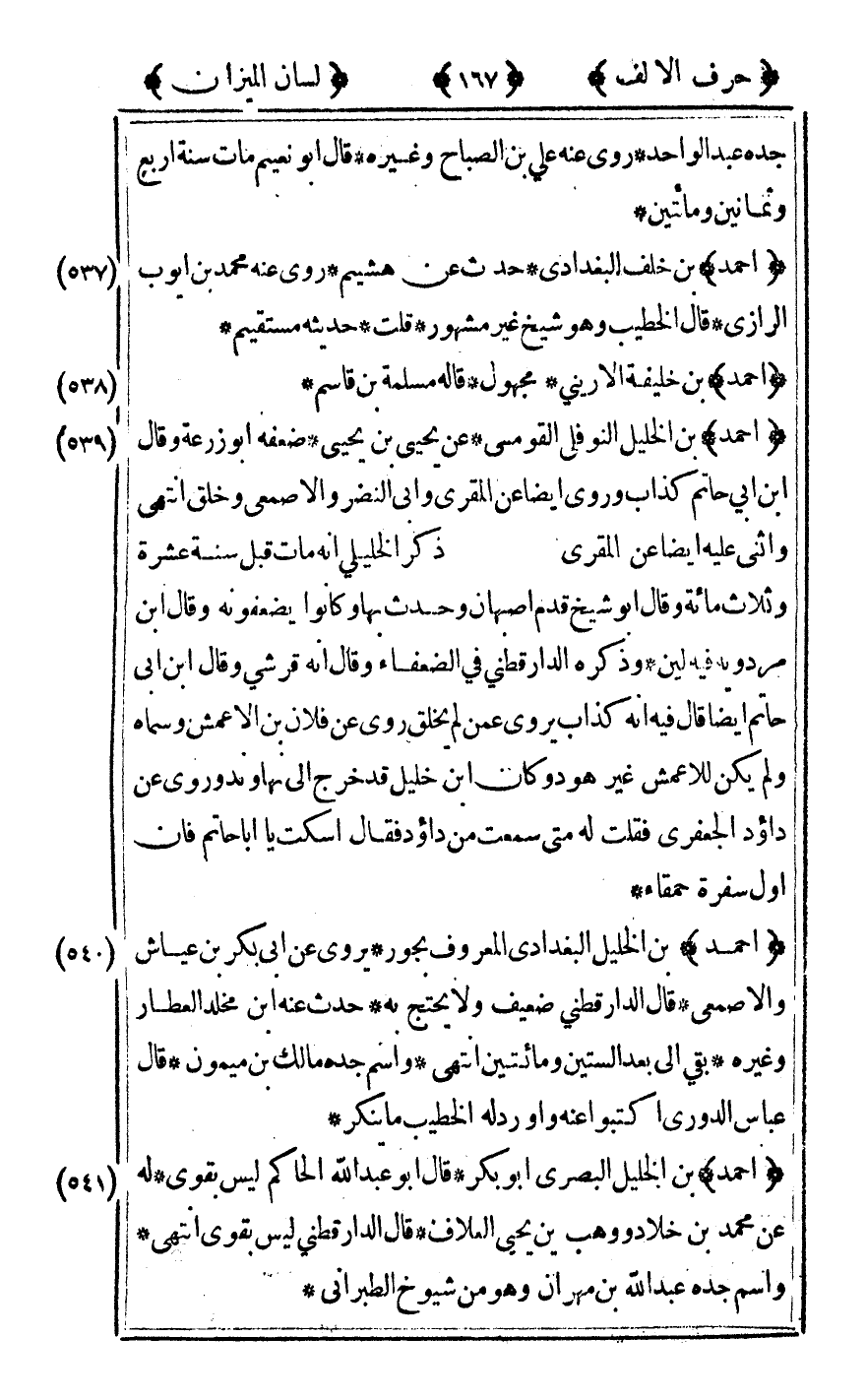 [541] "أحمد" بن الخليل البصري أبو بكر قال أبو عبد الله الحاكم ليس بقوي له عن محمد بن خلاد ووهب بن يحيى العلاف قال الدارقطني ليس بقوي انتهى.