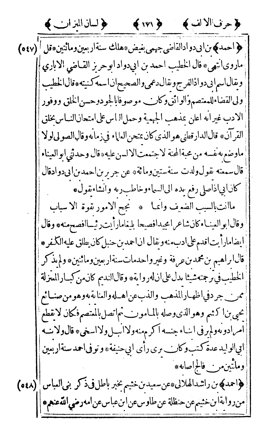 [547] "أحمد" بن أبي داود القاضي جهمي بغيض هلك سنة أربعين ومائتين قل ما روى انتهى قال الخطيب أحمد بن أبي داود أبو حريز القاضي الأباري ويقال اسم أبي داود الفرج ويقال دعمي والصحيح أن اسمه كنيته قال الخطيب ولي القضاء للمعتصم والواثق وكان موصوفا بالجود وحسن الخلق ووفور الأدب غير أنه أعلن بمذهب الجهمية وحمل الناس عي امتحان الناس بخلق القرآن قال الدارقطني هو الذي كان يمتحن العلماء في زمانه وقال الصولي لولا ما وضع به نفسه من محبة المحنة لاجمتعت الألسن عليه قال وحدثني أبو العيناء قال سمعته يقول ولدت سنة ستين ومائة عن جرير بن أحمد بن أبي داود قال كان أبي إذا صلى رفع يده إلى السماء وخاطب ربه وإنشاء يقول.