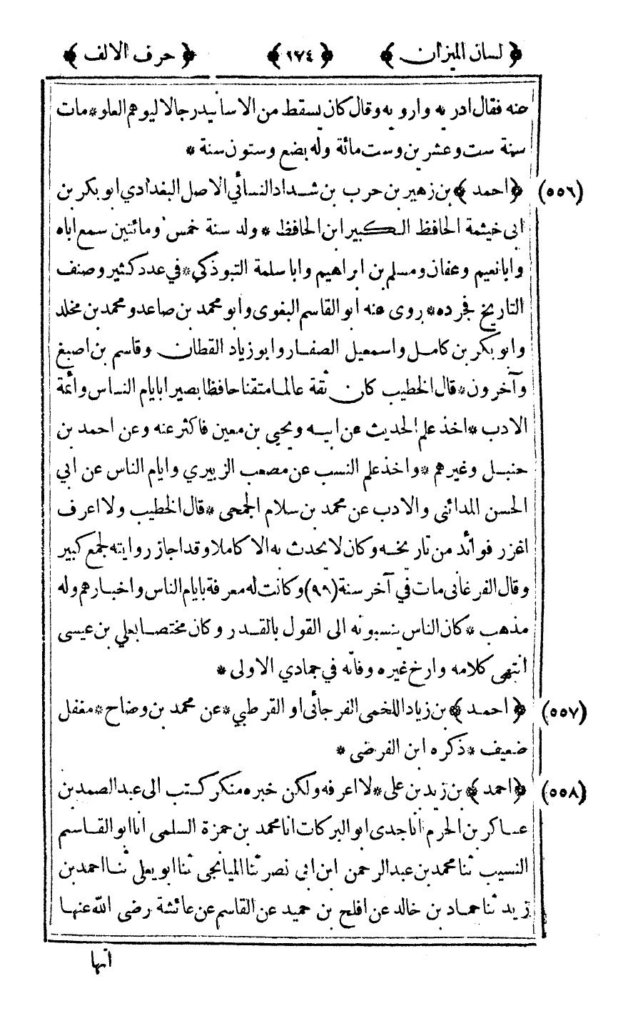 [558] "أحمد" بن زيد بن علي لا أعرفه ولكن خبره منكر كتب إلى عبد الصمد بن عساكر بن الحرم أنا جدي أبو البركات أنا محمد بن حمزة السلمي أنا أبو القاسم النسيب ثنا محمد بن عبد الرحمن بن أبي نصر ثنا الميانجي ثنا أبو يعلى ثنا أحمد بن زيد ثنا حماد بن خالد عن أفلح بن حميد عن القاسم عن عائشة رضى الله تعالى عنها