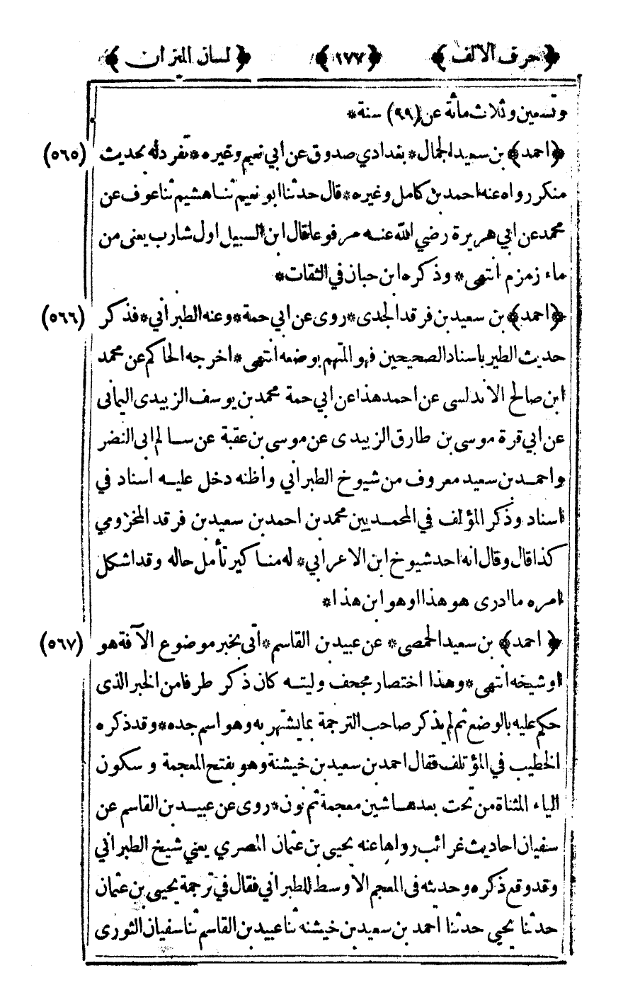 [565] "أحمد" بن سعيد الجمال بغدادي صدوق عن أبي نعيم وغيره تفرد له بحديث منكر رواه عنه أحمد بن كامل وغيره قال حدثنا أبو نعيم ثنا هشيم ثنا عوف عن محمد عن أبي هريرة رضى الله تعالى عنه مرفوعا قال ابن السبيل أول شارب يعني من ماء زمزم انتهى وذكره ابن حبان في الثقات.