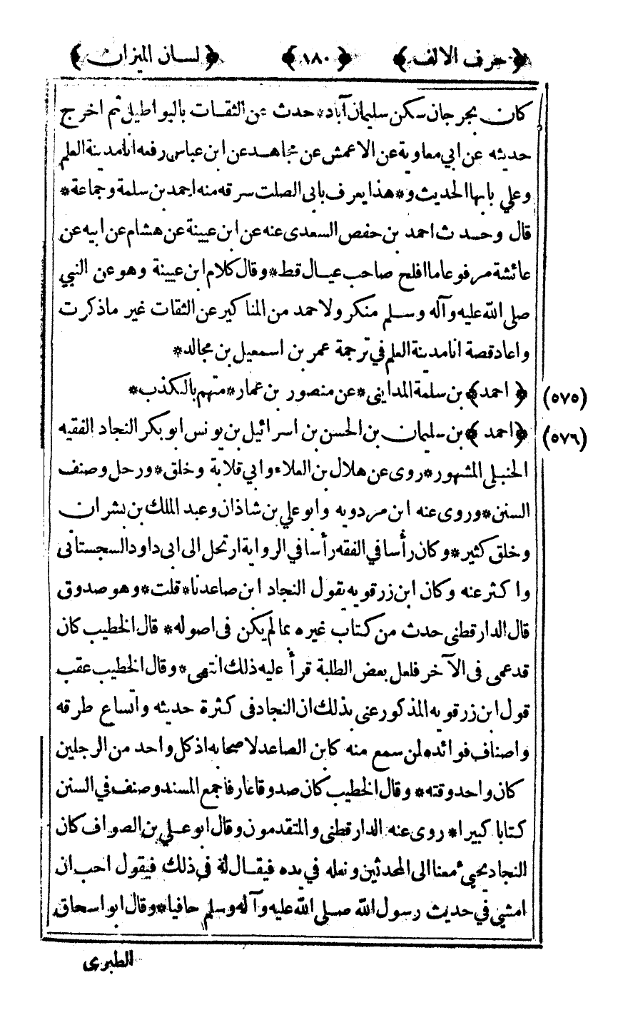 [576] "أحمد" بن سليمان بن الحسن بن إسرائيل بن يونس أبو بكر النجاد الفقيه الحنبلي المشهور روى عن هلال بن العلاء وأبي قلابة وخلق ورحل وصنف السنن وروى عنه ابن مردويه وأبو علي بن شاذان وعبد الملك بن بشران وخلق كثير وكان رأسا في الفقه رأسا في الرواية ارتحل إلى أبي داود السجستاني وأكثر عنه وكان بن زرقويه يقول النجاد بن صاعدنا قلت وهو صدوق قال الدارقطني حدث من كتاب غيره بما لم يكن في أصوله قال الخطيب كان قد عمي في الآخر فلعل بعض الطلبة قرأ عليه ذلك انتهى وقال الحطيب عقب قول بن زرقويه المذكور عني بذلك أن النجاد في كثرة حديثه واتساع طرقه وأصناف فوائد لمن سمع منه كابن الصاعد لأصحابه إذ كل واحد من الرجلين كان واحد وقته وقال الخطيب كان صدوقا عارفا جمع المسند وصنف في السنن كتابا كبيرا روى عنه الدارقطني والمتقدمون وقال أبو علي بن الصواف كان النجاد يجيء معنا إلى المحدثين ونعله في يده فيقال له في ذلك فيقول أحب أن أمشي في حديث رسول الله صلى الله عليه وسلم حافيا وقال أبو إسحاق