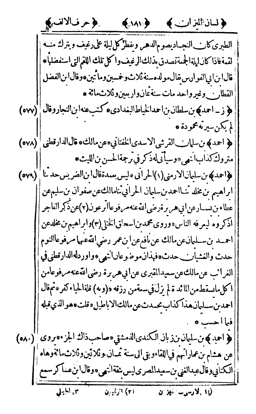 [580] "أحمد" بن سليمان بن زبان الكندي الدمشقي صاحب ذاك الجزء يروي عن هاشم بن عمار اتهم في اللقاء وبقي إلى سنة ثمان وثلاثين وثلاث مائة وهاه الكتاني وقال عبد الغني بن سعيد المصري ليس بثقة انتهى وقال ابن عساكر سمع