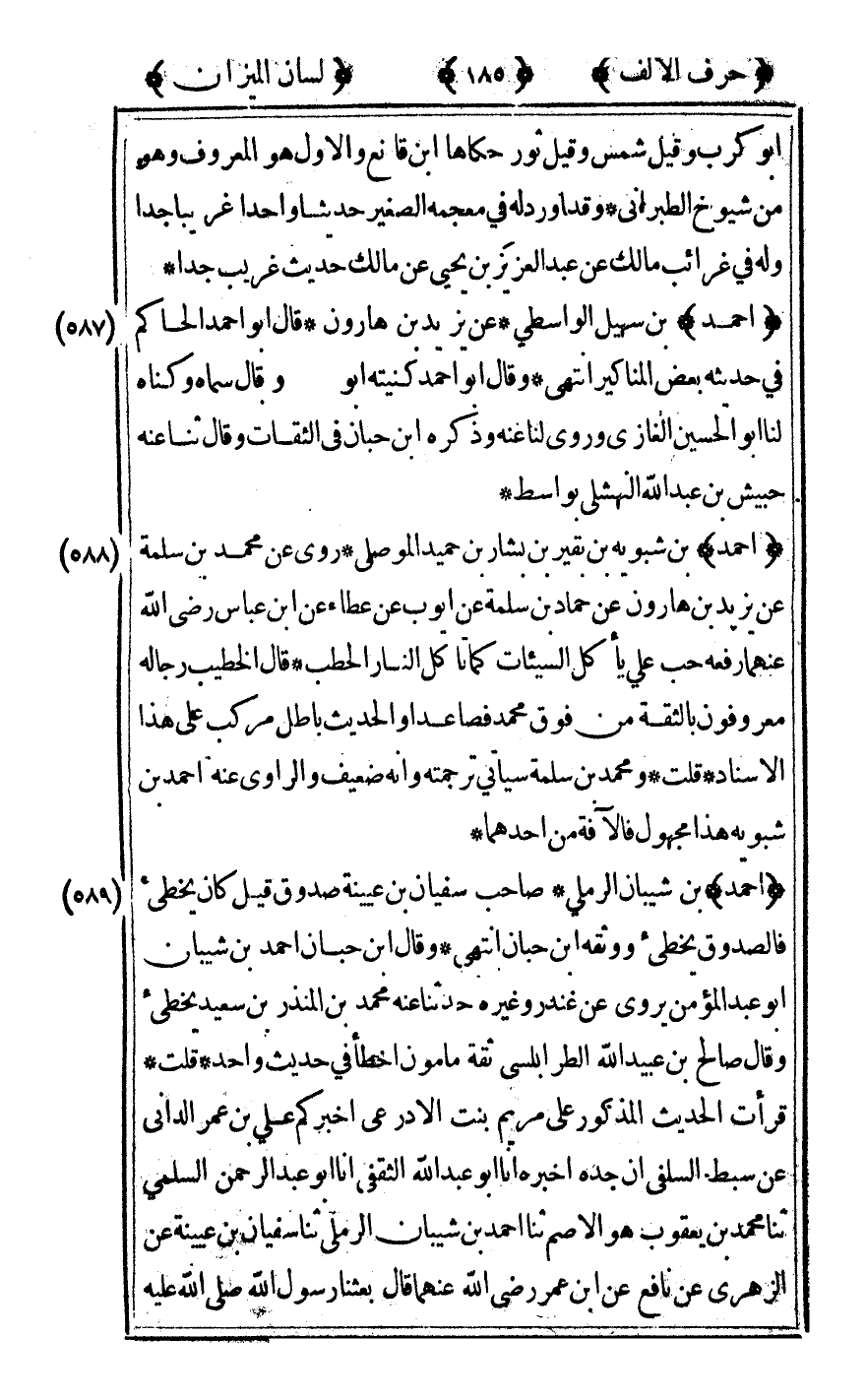 [589] "أحمد" بن شيبان الرملي صاحب سفيان بن عيينة صدوق قيل كان يخطىء فالصدوق يخطىء ووثقه بن حبان انتهى وقال ابن حبان أحمد بن شيبان أبو عبد المؤمن يروي عن غندر وغيره حدثنا عنه محمد بن المنذر بن سعيد يخطىء وقال صالح بن عبيد الله الطرابلسي ثقة مأمون أخطأ في حديث واحد قلت قرأت الحديث المذكور على مريم بنت الأدرعي أخبركم علي بن عمر الداني عن سبط السلفي أن جده أخبره أنا أبو عبد الله الثقفي أنا أبو عبد الرحمن السلمي ثنا محمد بن يعقوب هو الأصم ثنا أحمد بن شيبان الرملي ثنا سفيان بن عيينة عن الزهري عن نافع عن ابن عمر رضى الله تعالى عنهما قال بعثنا رسول الله صلى الله عليه