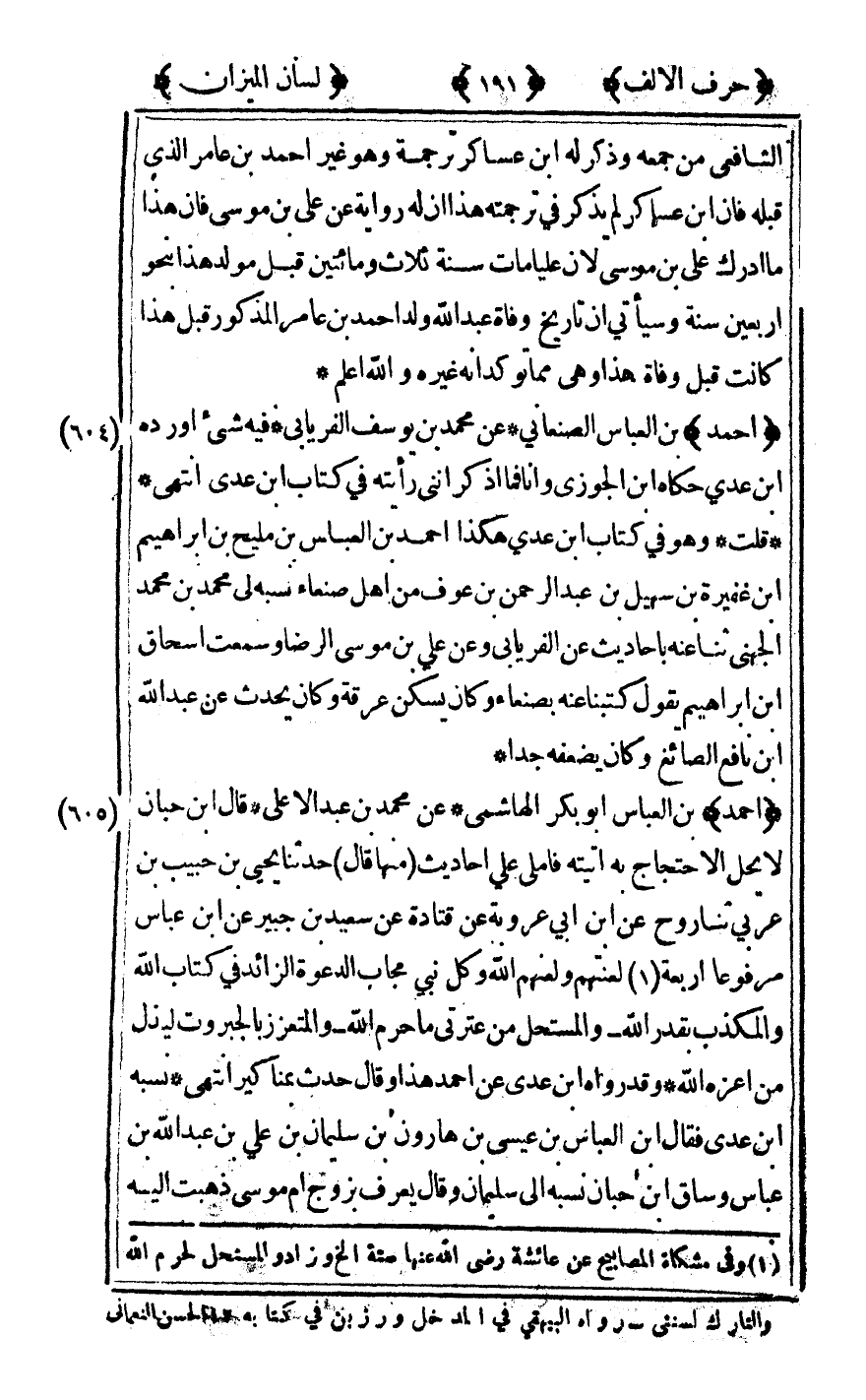 [604] "أحمد" بن العباس الصنعاني عن محمد بن يوسف الفريابي فيه شيء أورده بن عدي حكاه بن الجوزي وأنا فما اذكر أنني رأيته في كتاب بن عدي انتهى.