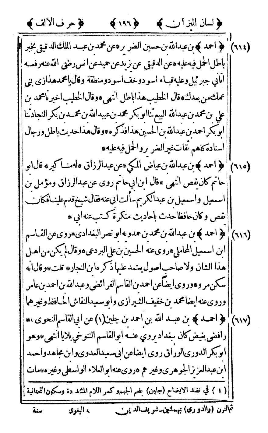 [617] "أحمد" بن عبد الله بن أحمد بن جلين1 عن أبي القاسم النحوي رافضي بغيض كان ببغداد يروي عنه أبو القاسم التنوخي بلايا انتهى وهو أبو بكر الدوري الوراق روى أيضا عن أبي سعيد العدوي وابن مجاهد وأحمد بن عبد العزيز الجوهري وغيرهم روى عنه أبو العلاء الواسطي وغيره مات