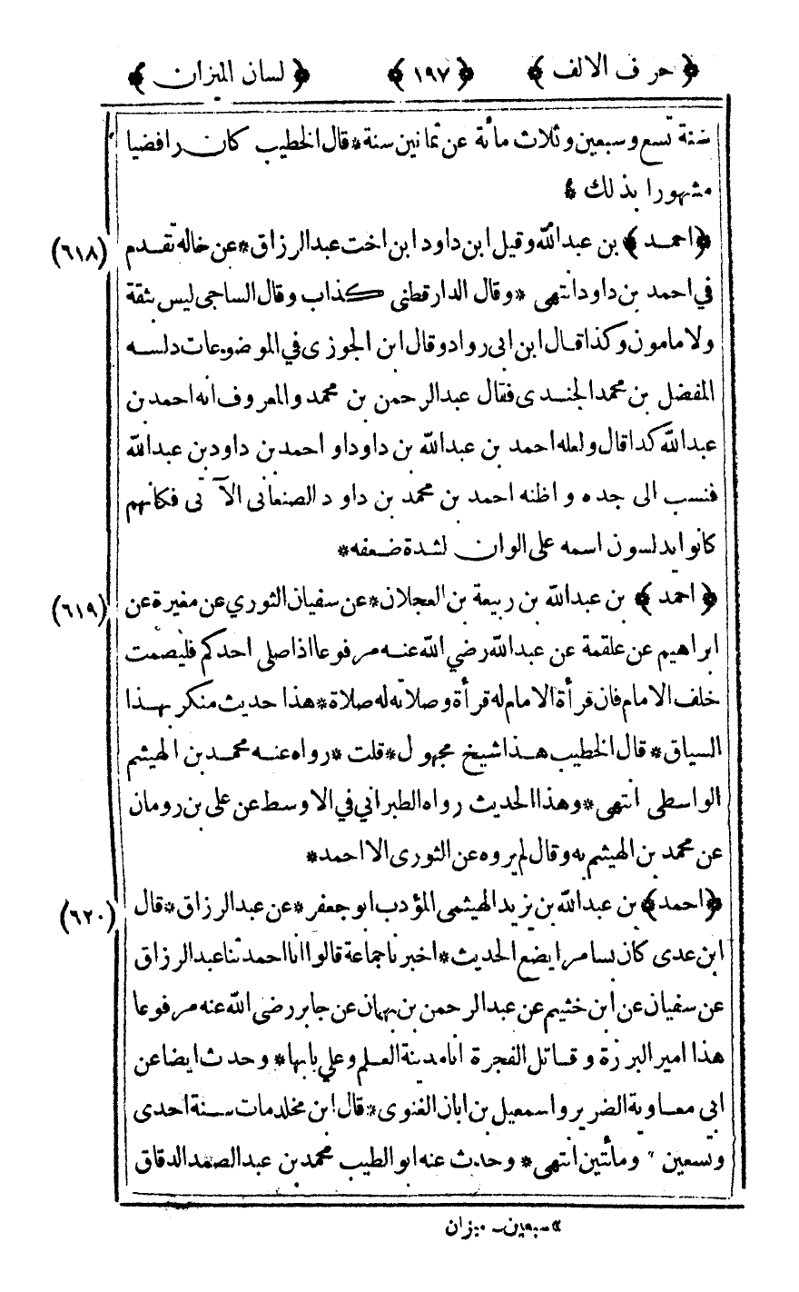 [618] "أحمد" بن عبد الله وقيل بن داود بن أخت عبد الرزاق عن خاله تقدم في أحمد بن داود انتهى وقال الدارقطني كذاب وقال الساجي ليس بثقة ولا مأمون وكذا قال ابن أبي رواد وقال ابن الجوزي في الموضوعات دلسه المفضل بن محمد الجندي فقال عبد الرحمن بن محمد والمعروف أنه أحمد بن عبد الله كذا قال ولعله أحمد بن عبد الله بن داود أو أحمد بن داود بن عبد الله فنسب إلى جده وأظنه أحمد بن محمد بن داود الصنعاني الآتي فكأنهم كانوا يدلسون اسمه على الوان لشدة ضعفه.