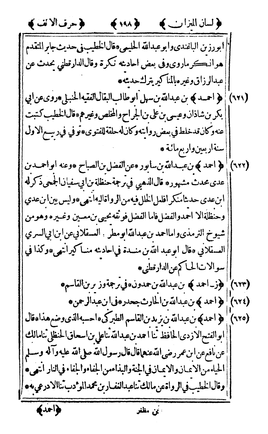 [622] "أحمد" بن عبد الله بن سابور عن الفضل بن الصباح وعنه أبو أحمد بن عدي محدث مشهور قال الذهبي في ترجمة حنظلة بن أبي سفيان الجمحي ذكر له بن عدي حديثا منكرا فلعل الخلل فيه من الرواة إليه انتهى وليس بين بن عدي وحنظلة إلا أحمد والفضل فأما الفضل فوثقه يحيى بن معين وغيره وهو من شيوخ الترمذي وأما أحمد بن عبد الله أبو مطر العسقلاني عن ابن أبي السري العسقلاني قال أبو عبد الله بن مندة في أحاديثه مناكير انتهى وكذا في سؤالات الحاكم عن الدارقطني.