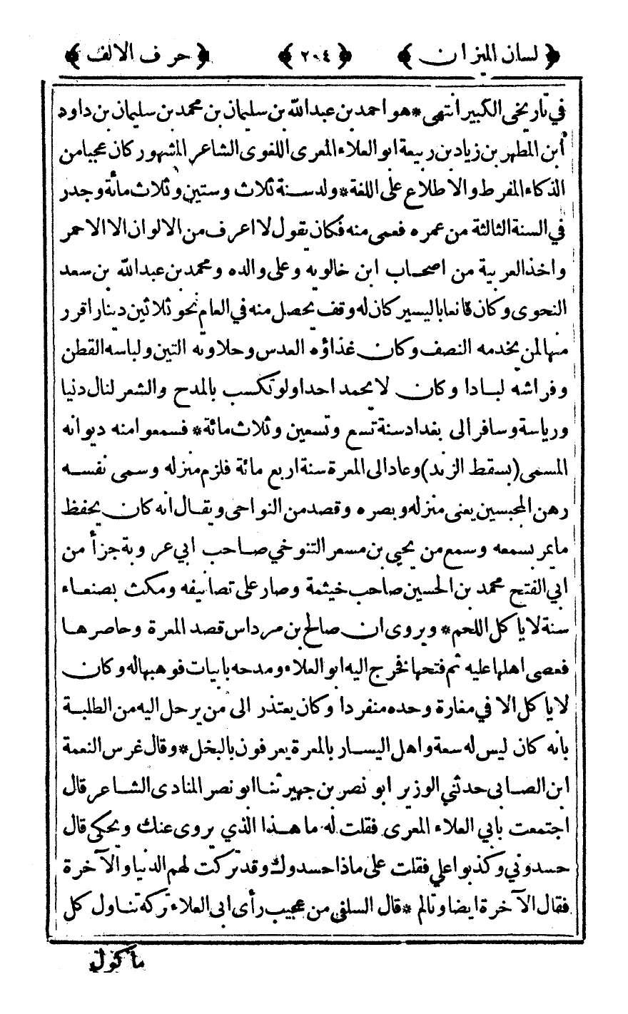 في تاريخي الكبير انتهى هو أحمد بن عبد الله بن سليمان بن محمد بن سليمان بن داود بن المطهر بن زياد بن ربيعة أبو العلاء المعري اللغوي الشاعر المشهور كان عجبا من الذكاء المفرط والاطلاع على اللغة ولد سنة ثلاث وستين وثلاث مائة وجدر في السنة الثالثة من عمره فعمى منه فكان يقول لا أعرف من الألوان إلا الأحمر وأخذ العربية من أصحاب بن خالويه وعلى والده ومحمد بن عبد الله بن سعد النحوي وكان قانعا باليسير كان له وقف يحصل منه في العام نحو ثلاثين دينارا قرر منها لمن يخدمه النصف وكان غذاؤه العدس وحلاوته التين ولباسه القطن وفراشه لبادا وكان لا يحمد أحدا ولو تكسب بالمدح والشعر لنال دنيا ورياسة وسافر إلى بغداد سنة تسع وتسعين وثلاث مائة فسمعوا منه ديوانه المسمى بسقط الزند وعاد إلى المعرة سنة أربع مائة فلزم منزله وسمى نفسه هن المحبسين يعني منزله وبصره وقصد من النواحي ويقال أنه كان يحفظ ما يمر بسمعه وسمع من يحيى بن مسعر التنوخي صاحب أبي عروبة جزأ من أبي الفتح محمد بن الحسين صاحب خيثمة وصار على تصانيفه ومكث بصنعاء سنة لا يأكل اللحم ويروى أن صالح بن مرداس قصد المعرة وحاصرها فعصى أهلها عليه ثم فتحها فخرج إليه أبو العلاء ومدحه بأبيات فوهبها له وكان لا يأكل إلا في مغارة وحده منفردا وكان يعتذر إلى من يرحل إليه من الطلبة بأنه كان ليس له سعة وأهل اليسار بالمعرة يعرفون بالبخل وقال غرس النعمة بن الصابي حدثني الوزير أبو نصر بن جهير ثنا أبو نصر المنادى الشاعر قال اجتمعت بأبي العلاء المعري فقلت له ما هذا الذي يروى عنك ويحكى قال حسدوني وكذبوا علي فقلت على ماذا حسدوك وقد تركت لهم الدنيا والآخرة فقال الآخرة أيضا وتألم قال السلفي من عجيب رأي أبي العلاء تركه تناول كل