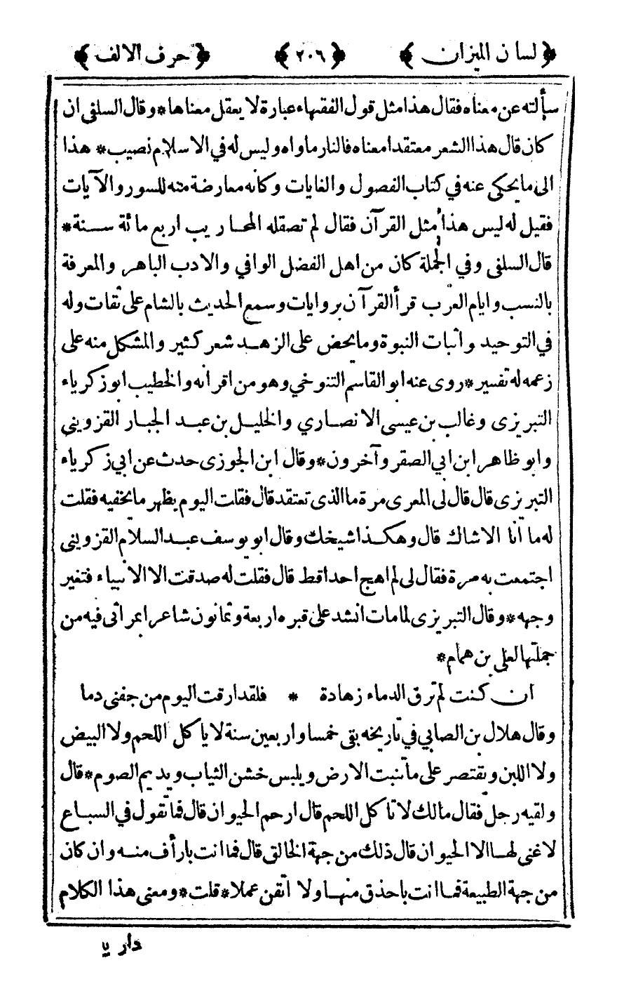 سألته عن معناه فقال هذا مثل قوم الفقهاء عبارة لا يعقل معناه وقال السلفي أن كان قال هذا الشعر معتقدا معناه فالنار ما واه وليس له في الإسلام نصيب هذا إلى ما يحكى عنه في كتاب الفصول والغايات وكأنه معارضة منه للسور والآيات فقيل له ليس هذا مثل القرآن فقال لم تصقله المحاريب أربع مائة سنة قال السلفي وفي الجملة كان من أهل الفضل الوافي والأدب الباهر والمعرفة بالنسب وأيام العرب قرأ القرآن بروايات وسمع الحديث بالشام على ثقات وله في التوحيد وإثبات النبوة وما يحض على الزهد شعر كثير والمشكل منه على زعمه له تفسير روى عنه أبو القاسم التنوخي وهو من أقرانه والخطيب أبو زكريا التبريزي وغالب بن عيسى الأنصاري والخليل بن عبد الجبار القزويني وأبو ظاهر بن أبي الصقر وآخرون وقال ابن الجوزي حدث عن أبي زكريا التبريزي قال قال لم المعري مرة ما الذي تعتقد قال فقلت اليوم بظهر ما يخفيه فقلت له ما أنا إلا شاك قال وهكذا شيخك وقال أبو يوسف عبد السلام القزويني اجتمعت به مرة فقال لي لم أهج أحدا قط قال فقلت له صدقت إلا الأنبياء فتغير وجهه وقال التبريزي لما مات انشد على قبره أربعة وثمانون شاعرا بمراثي فيه من جملتها لعلي بن همام.