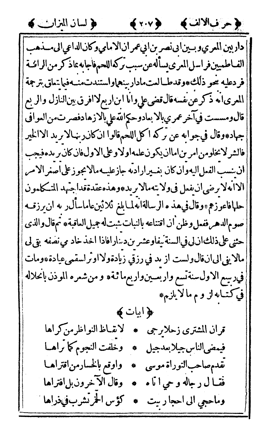 دار بين المعري وبين أبي نصر بن أبي عمران الأمامي وكان الداعي إلى مذهب الفاطميين فراسل المعري يسأله عن سبب تركه اللحم فأجابه بما ذكر من الرأفة فرد عليه بنحو ذلك وقد طالعت ما دار بينهما واستندت منه فيما يتعلق بترجمة المعري أنه ذكر عن نفسه قال قضى علي وأنا بن أربع لا أفرق بين النازل والربع قال ومسست في آخر عمري بالإبعاد وحكم الله علي بالإزهاد فصرت من العوافي جهاد وقال في جوابه عن تركه أكل اللحم قالوا إن كان ربنا لا يريد إلا الخير فالشر لا يخلو من أمرين أما إن يكون علمه أولا وعلى الأول فإن كان يريده فيجب أن ينسب الفعل إليه وإن كان بغير إرادته جاز عليه مالا يجوز على أصغر الأمر إلا أنه لا يرضى أن يفعل في ولايته مالا يريد وهذه عقدة قد اجتهد المتكلمون حلها فاعوزهم وقال في هذه الرسالة أنه لما بلغ ثلاثين عاما سأل ربه أن يرزقه صوم الدهر ففعل وظن أن اقتناعه بالنبات يثبت له جميل العاقبة ثم قال والذي حثني على ذلك إن لي في السنة نيفا وعشرين دنيارا فإذا أخذ خادمي نصفه بقي لي مالا يفي إلى أن قال ولست أزيد في رزقي زيادة ولا أوثر لسقمي عيادة ومات في ربيع الأول سنة تسع وأربعين وأربع مائة ومن شعره المؤذن بانحلاله في كتابه لزوم مالا يلزم.