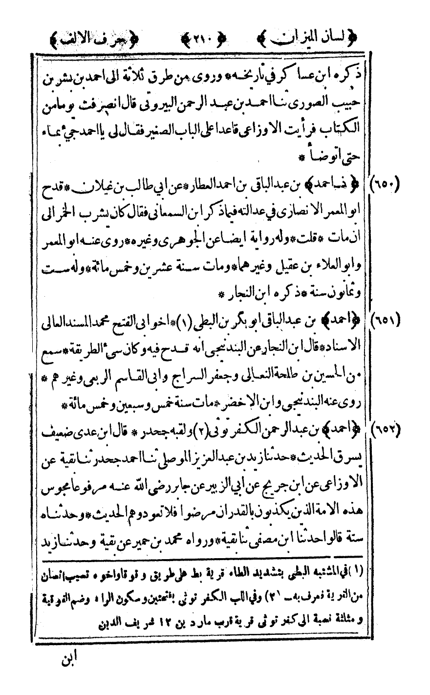 [651] "أحمد" بن عبد الباقي أبو بكر بن البطي1 أخو أبي الفتح محمد المسند العالي الإسناد قال ابن النجار عن البندنيجي أنه قدح فيه وكان سيء الطريقة سمع من الحسين بن طلحة النعالي وجعفر السراج وأبي القاسم الربعي وغيرهم روى عنه البندنيجي وابن الأخضر مات سنة خمس وسبعين وخمس مائة.