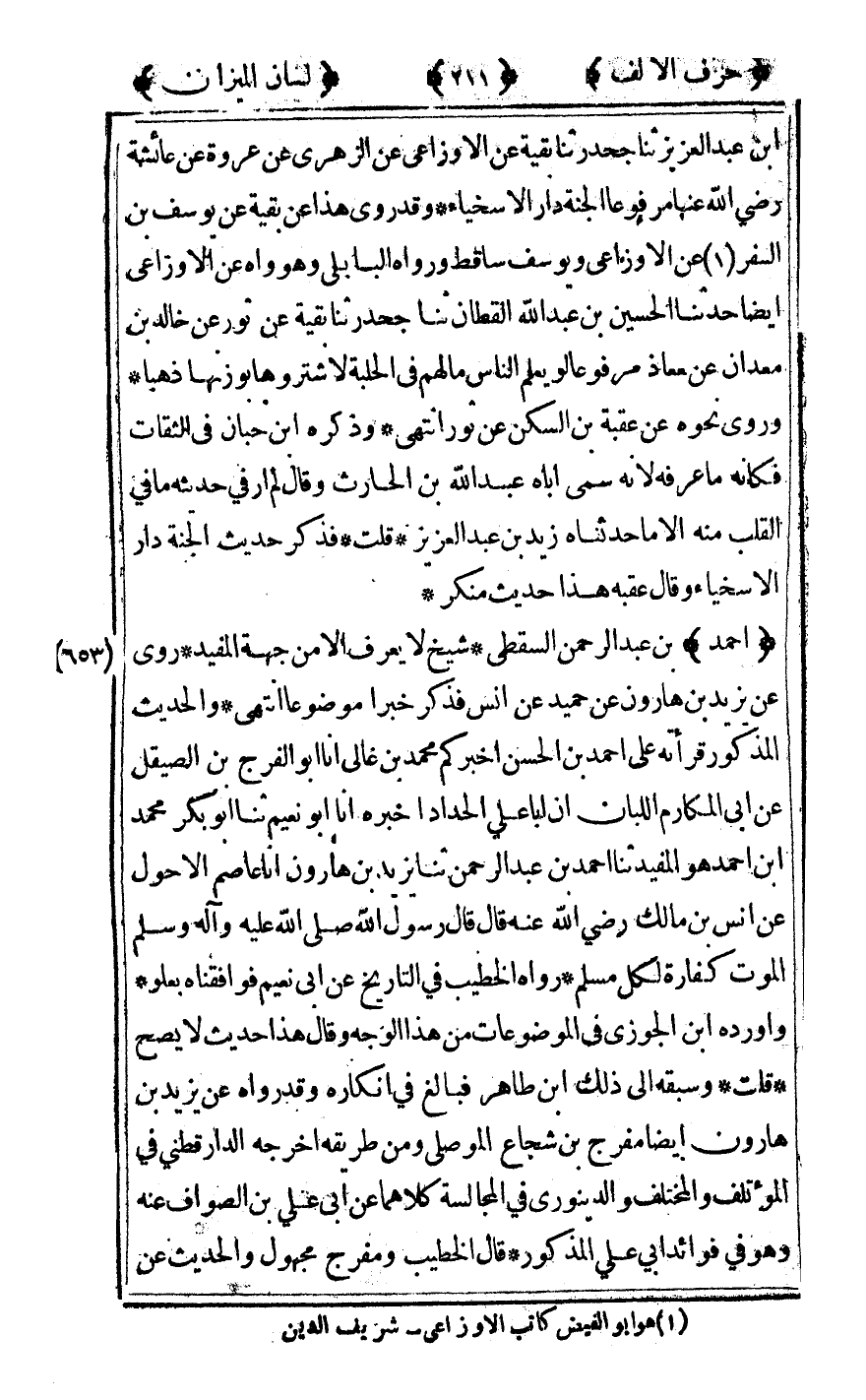 [653] "أحمد" بن عبد الرحمن السقطي شيخ لا يعرف إلا من جهة المفيد روى عن يزيد بن هارون عن حميد عن أنس فذكر خبرا موضوعا انتهى والحديث المذكور قرأته على أحمد بن الحسن أخبركم محمد بن غالي أنا أبو الفرج بن الصيقل عن أبي المكارم اللبان أن أبا علي الحداد أخبره أنا أبو نعيم ثنا أبو بكر محمد بن أحمد هو المفيد ثنا أحمد بن عبد الرحمن ثنا يزيد بن هارون أنا عاصم الأحول عن أنس بن مالك رضى الله تعالى عنه قال قال رسول الله صلى الله عليه وسلم: " الموت كفارة لكل مسلم" رواه الخطيب في التاريخ عن أبي نعيم فوافقناه بعلو وأورده بن الجوزي في الموضعات من هذا الوجه وقال هذا حديث لا يصح قلت وسبقه إلى ذلك بن طاهر فبالغ في إنكاره وقد رواه عن يزيد بن هارون أيضا مفرج بن شجاع الموصلي ومن طريقه أخرجه الدارقطني في المؤتلف والمختلف والدينوري في المجالسة كلاهما عن أبي علي بن الصواف عنه وهو في فوائد أبي علي المذكور قال الخطيب ومفرج مجهول والحديث عن