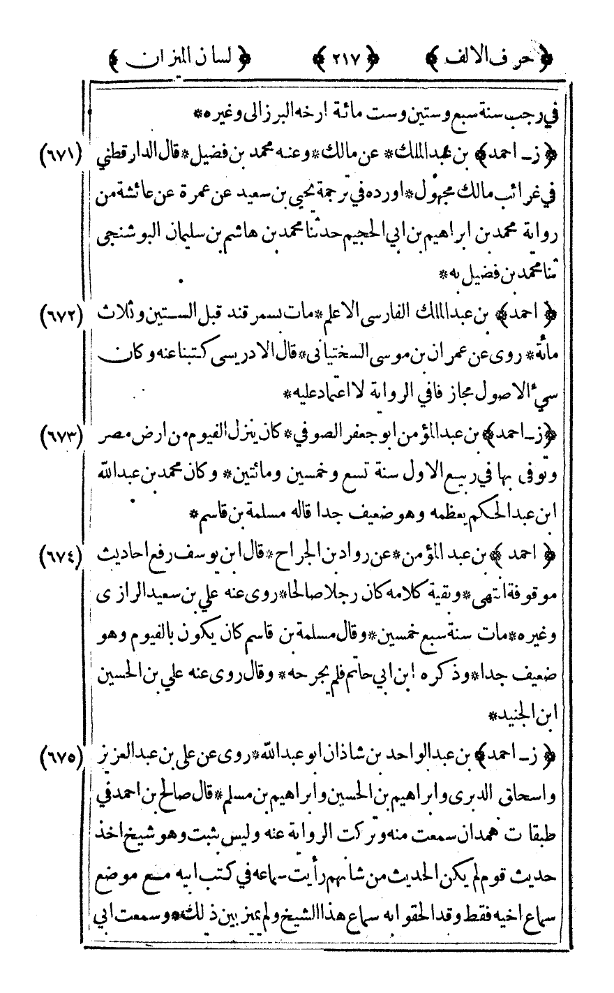 [673] "ز - أحمد" بن عبد المؤمن أبو جعفر الصوفي كان ينزل الفيوم من أرض مصر وتوفي بها في ربيع الأول سنة تسع وخمسين ومائتين وكان محمد بن عبد الله بن عبد الحكم يعظمه وهو ضعيف جدا قاله مسلمة بن قاسم.