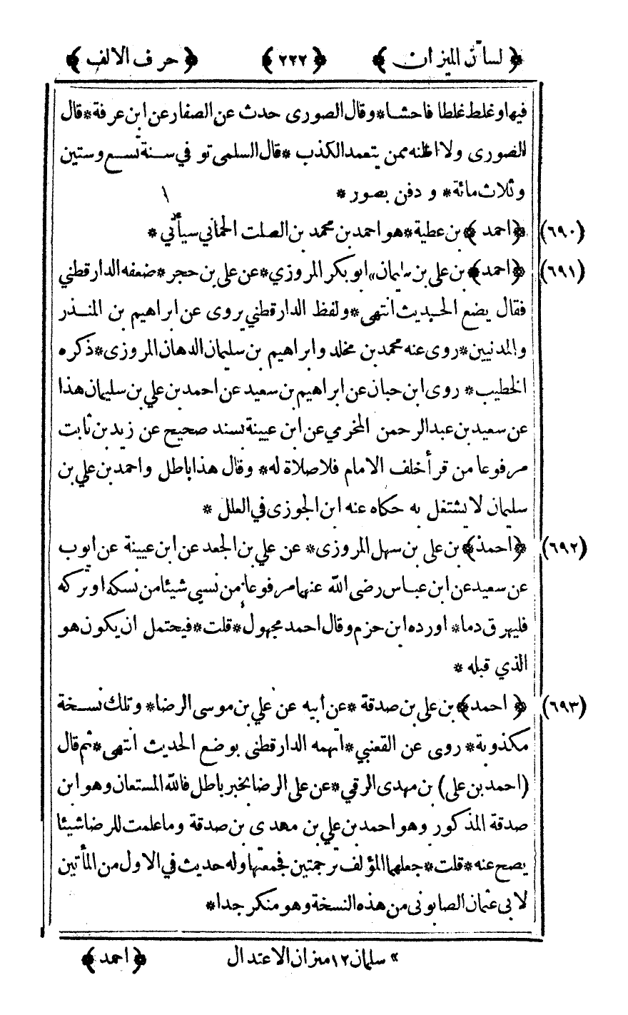 [691] "أحمد" بن علي بن سليمان أبو بكر المروزي عن علي بن حجر ضعفه الدارقطني فقال يضع الحديث انتهى ولفظ الدارقطني يروي عن إبراهيم بن المنذر والمدنيين روى عنه محمد بن مخلد وإبراهيم بن سليمان الدهان المروزي ذكره الخطيب روى ابن حبان عن إبراهيم بن سعيد عن أحمد بن علي بن سليمان هذا عن سعيد بن عبد الرحمن المخرمي عن ابن عيينة بسند صحيح عن زيد بن ثابت مرفوعا من قرأ خلف الإمام فلا صلاة له وقال هذا باطل وأحمد بن علي بن سليمان لا يشتغل به حكاه عنه ابن الجوزي في العلل.