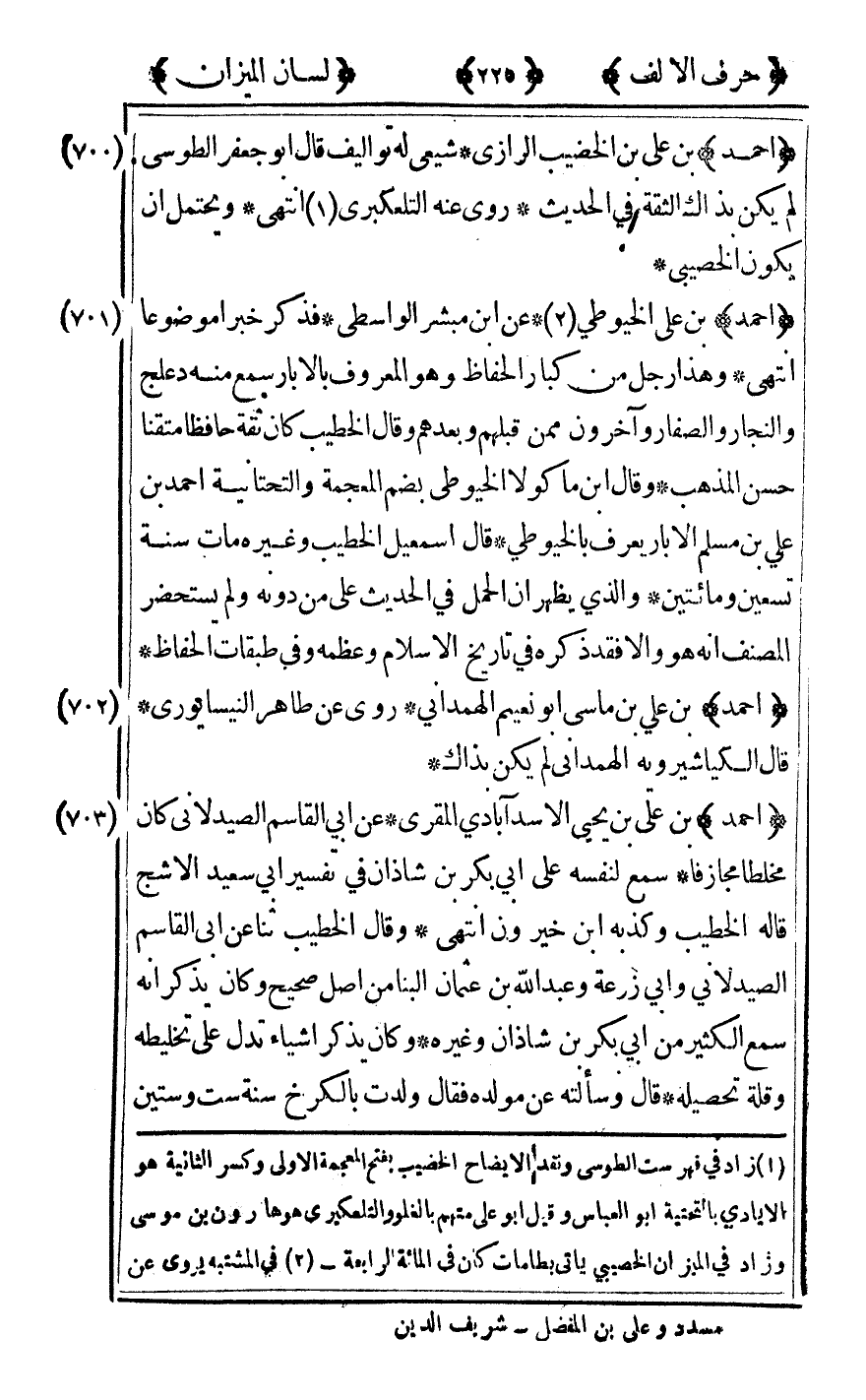 [703] "أحمد" بن علي بن يحيى الأسدآباذي المقري عن أبي القاسم الصيدلاني كان مخلطا مجازفا سمع لنفسه على أبي بكر بن شاذان في تفسير أبي سعيد الأشج قاله الخطيب وكذبه بن خيرون انتهى وقال الخطيب ثنا عن أبي القاسم الصيدلاني وأبي زرعة وعبد الله بن عثمان البنا من أصل صحيح وكان يذكر أنه سمع الكثير من أبي بكر بن شاذان وغيره وكان يذكر أشياء تدل على تخليطه وقله تحصيله قال وسألته عن مولده فقال ولدت بالكرخ سنة ست وستين