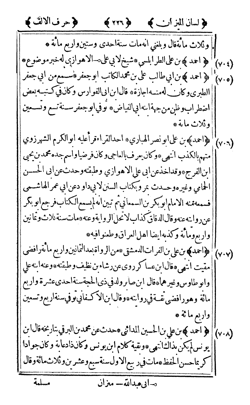 [708] "أحمد" بن علي بن الحسين المدائني حدث عن محمد بن البرقي بتاريخه قال ابن يونس لم يكن بذاك انتهى وبقية كلام بن يونس وكان ذا دعابة وكان جوادا كريما حسن الحفظ مات في ربيع الأول سنة سبع وعشرين وثلاث مائة وقال