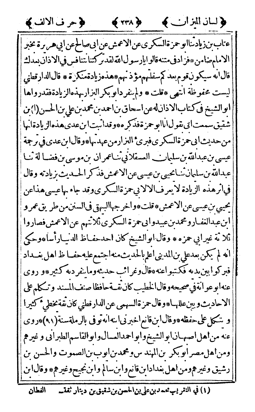 عتاب بن زياد ثنا أبو حمزة السكري عن الأعمش عن أبي صالح عن أبي هريرة بخبر الإمام ضامن فزاد في متنه قالوا يا رسول الله لقد تركتنا نتنافس في الأذان بعدك قال "أنه سيكون قوم بعدكم سفلتهم مؤذنهم" هذه زيادة منكرة قال الدارقطني ليست محفوظة انتهى قلت ولم ينفرد أبو بكر البزار بهذه الزيادة فقد رواها أبو الشيخ في كتاب الأذان له عن إسحاق بن أحمد بن محمد بن علي بن الحسن1 بن شقيق سمعت أبي يقول أنا أو حمزة فذكره وقد أثبت بن عدي هذه الزيادة أنها من حديث أبي حمزة السكري فبريء البزار من عهدتها وقال ابن عدي في ترجمة عيسى بن عبد الله بن سليمان العسقلاني ثنا عمران بن موسى بن فضالة ثنا عبد الله بن سليمان ثنا يحيى بن عيسى عن الأعمش فذكر الحديث بزيادته وقال في أثر هذا الزيادة لا يعرف إلا لأبي حمزة السكري وقد جاء بها عيسى هذا عن يحيى بن عيسى عن الأعمش قلت وأخرجها البيهقي في السنن من طريق عمرو بن عبد الغفار ومحمد بن عبيد وأبي حمزة السكري ثلاثتهم عن الأعمش فصاروا ثلاثة غير أبي حمزة وقال أبو الشيخ كان أحد حفاظ الدنيا رأسا وحكى أنه لم يكن بعد علي بن المديني أعلم بالحديث منه اجتمع عليه حفاظ أهل بغداد فبركوا بين يديه فكتبوا عنه قال وغرائب حديثه وما ينفرد به كثير وروى عند أبو عوانة في صحيحه وقال الخطيب كان ثقة حافظ صنف المسند وتكلم على الأحاديث وبين عللها وقال حمزة السهمي عن الدارقطني كان ثقة يخطىء كثيرا ويتكل على حفظه وقال ابن قانع أخبرني ابنه أنه توفي بالرملة سنة 91 روى عنه من أهل أصبهان أبو الشيخ وأبو أحمد العسال وأبو القاسم الطبراني وغيرهم ومن أهل مصر أبو بكر بن المهندس ومحمد بن أيوب بن الصموت والحسن بن رشيق وغيرهم من أهل بغداد بن قانع وابن سالم وابن نجيح وغيرهم وقال ابن