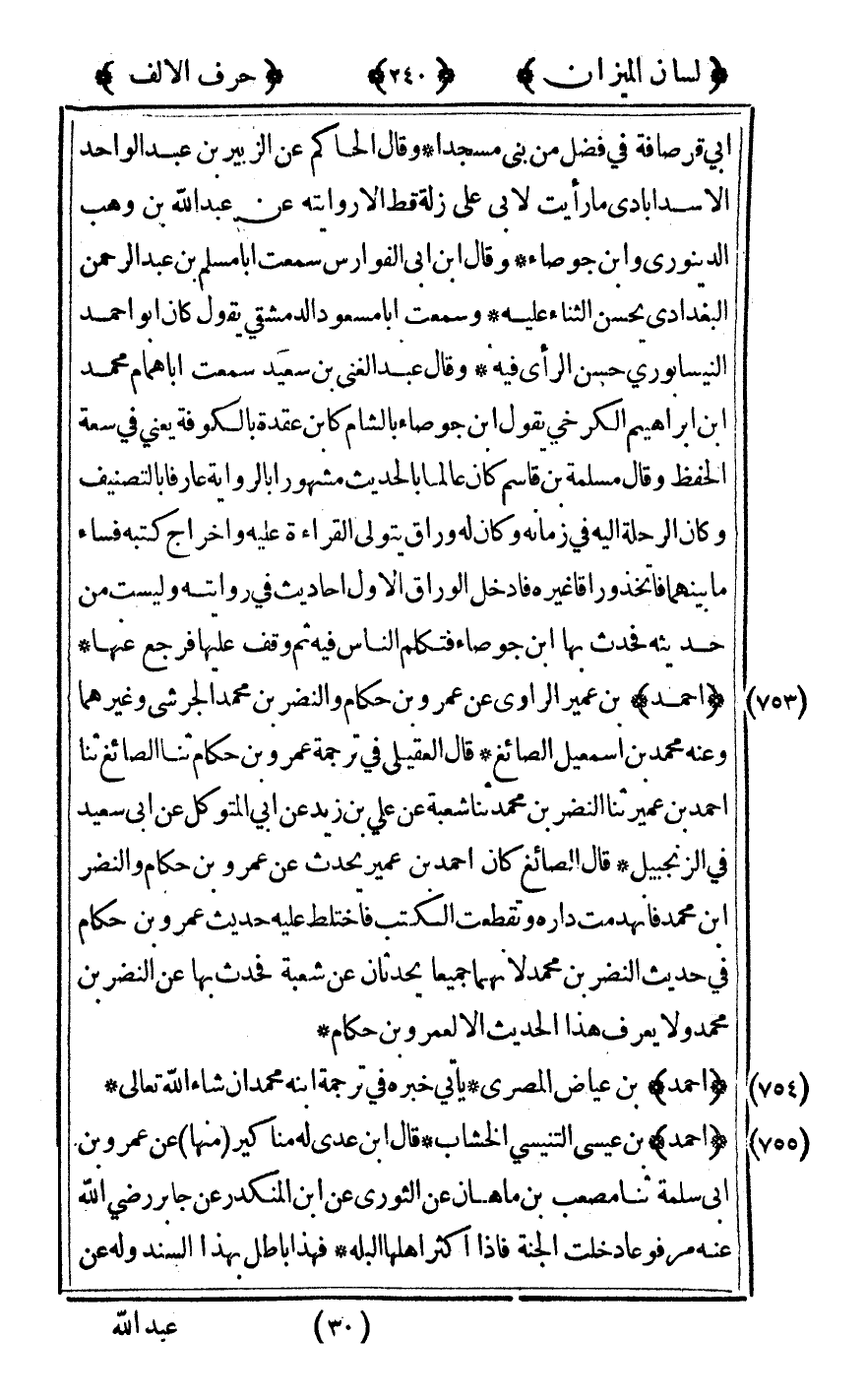 [755] "أحمد" بن عيسى التنيسي الخشاب قال ابن عدي له مناكير منها عن عمرو بن أبي سلمة ثنا مصعب بن ماهان عن الثوري عن ابن المنكدر عن جابر رضى الله تعالى عنه مرفوعا دخلت الجنة فإذا أكثر أهلها البله فهذا باطل بهذا السند وله عن