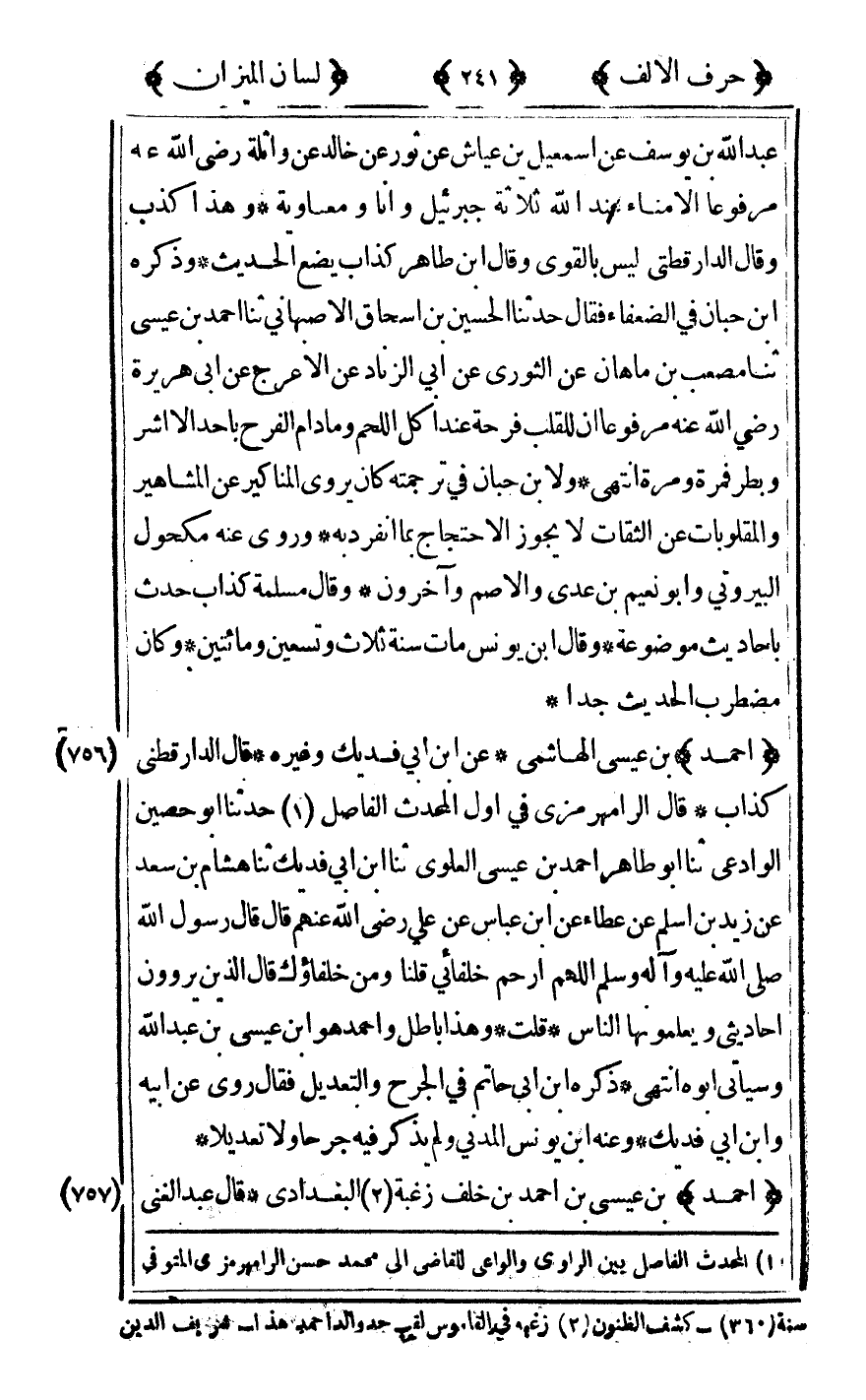 [756] "أحمد" بن عيسى الهاشمي عن ابن أبي فديك وغيره قال الدارقطني كذاب قال الرامهرمزي في أول المحدث الفاصل1 حدثنا أبو حصين الوادعي ثنا أبو طاهر أحمد بن عيسى العلوي ثنا بن فديك ثنا هشام بن سعد عن زيد بن أسلم عن عطاء عن ابن عباس عن علي رضى الله تعالى عنهم قال قال رسول الله صلى الله عليه وسلم: "اللهم ارحم خلفائي" قلنا ومن خلفاؤك؟ قال: "الذين يروون أحاديثي ويعلمونها الناس" قلت وهذا باطل وأحمد هو بن عيسى بن عبد الله وسيأتي أبوه انتهى ذكره ابن أبي حاتم في الجرح والتعديل فقال روى عن أبيه وابن أبي فديك وعنه ابن يونس المدني ولم يذكر فيه جرحا ولا تعديلا