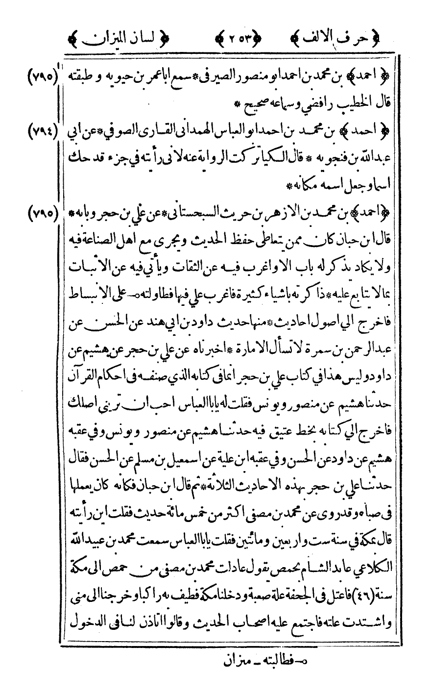 [795] "أحمد" بن محمد بن الأزهر بن حريث السجستاني عن علي بن حجر وبابه قال ابن حبان كان ممن يتعاطى حفظ الحديث ويجري مع أهل الصناعة فيه ولا يكاد يذكر له باب الا وأغرب فيه عن الثقات ويأتي فيه عن الأثبات بما لا يتابع عليه ذاكرته بأشياء كثيرة فأغرب علي فيها فطاولته على الإنبساط فأخرج إلى أصول أحاديث منها حديث داود بن أبي هند عن الحسن عن عبد الرحمن بن سمرة لا تسأل الإمارة أخبرناه عن علي بن حجر عن هشيم عن داود وليس هذا في كتاب علي بن حجر إنما في كتابه الذي صنفه في أحكام القرآن حدثنا هشيم عن منصور ويونس فقلت له يا أبا العباس أحب أن تريني أصلك فأخرج إلي كتابه بخط عتيق فيه حدثنا هشيم عن منصور ويونس وفي عقبه هشيم عن داود عن الحسن وفي عقبه بن علية عن إسماعيل بن مسلم عن الحسن فقال حدثنا علي بن حجر بهذه الأحاديث الثلاثة ثم قال ابن حبان فكأنه كان يعملها في صباه وقد روى عن محمد بن مصفى أكثر من خمس مائة حديث فقلت أين رأيته قال بمكة في سنة ست وأربعين ومائتين فقلت يا أبا العباس سمعت محمد بن عبيد الله الكلاعي عابد الشام بحمص يقول عادلت محمد بن مصفى من حمص إلى مكة سنة 46 فاعتل في الجحفة علة صعبة ودخلنا مكة فطيف به راكبا وخرجنا إلى منى واشتدت علته فاجتمع عليه أصحاب الحديث وقالوا أتأذن لنا في الدخول