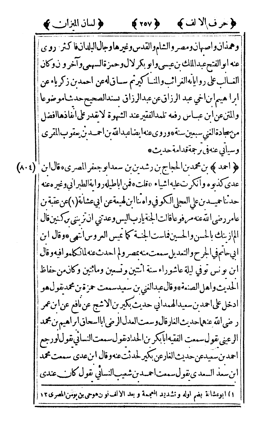 [804] "أحمد" بن محمد بن الحجاج بن رشدين بن سعد أبو جعفر المصري قال ابن عدي كذبوه وأنكرت عليه أشياء قلت فمن أباطيله رواية الطبراني وغيره عنه حدثنا حميد بن علي العجلي الكوفي واه ثنا بن لهيعة عن أبي عشانة1 عن عقبة بن عامر رضى الله تعالى عنه مرفوعا قالت الجنة يا رب أليس وعدتني أن تزينني بركنين قال ألم أزينك بالحسن والحسين فما ست الجنة كما تميس العروس انتهى وقال ابن أبي حاتم في الجرح والتعديل سمعت منه بمصر ولم أحدث عنه لما تكلموا فيه وقال ابن يونس توفي ليلة عاشوراء سنة اثنتين وتسعين ومائتين وكان من حفاظ الحديث وأهل الصنعة وقال عبد الغني بن سعيد سمعت حمزة بن محمد يقول هو ادخل على أحمد بن سعيد الهمداني حديث بكير بن الأشج عن نافع عن ابن عمر رضى الله تعالى عنهما حديث الغار قال وسعت العدل الرضى أبا إسحاق إبراهيم بن محمد الرعيني يقول سمعت الفقيه أبا بكر بن الحداد يقول سمعت النسائي يقول لو رجع أحمد بن سعيد عن حديث الغار عن بكير لحدثت عنه وقال ابن عدي سمعت محمد بن سعد السعدي يقول سمعت أحمد بن شعيب النسائي يقول كان عندي