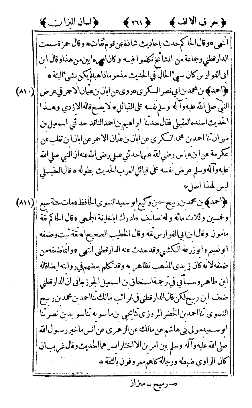 [810] "أحمد" بن محمد بن أبي نصر السكري ت السكوني روى عن أبان بن عثمان الأحمر في عرض النبي صلى الله عليه وسلم نفسه على القبائل لا يصح قاله الأزدي وهذا الحديث اسنده العقيلي فقال حدثنا إبراهيم بن أحمد الناقد حدثني إسماعيل بن مهران ثنا أحمد بن محمد السكري ت السكوني عن أبان بن عثمان الأحمر عن أبان بن تغلب عن عكرمة عن ابن عباس رضى الله تعالى عنهما حدثني علي رضى الله تعالى عنه أن النبي صلى الله عليه وسلم عرض نفسه على قبائل العرب الحديث بطوله قال العقيلي ليس لهذا أصل.