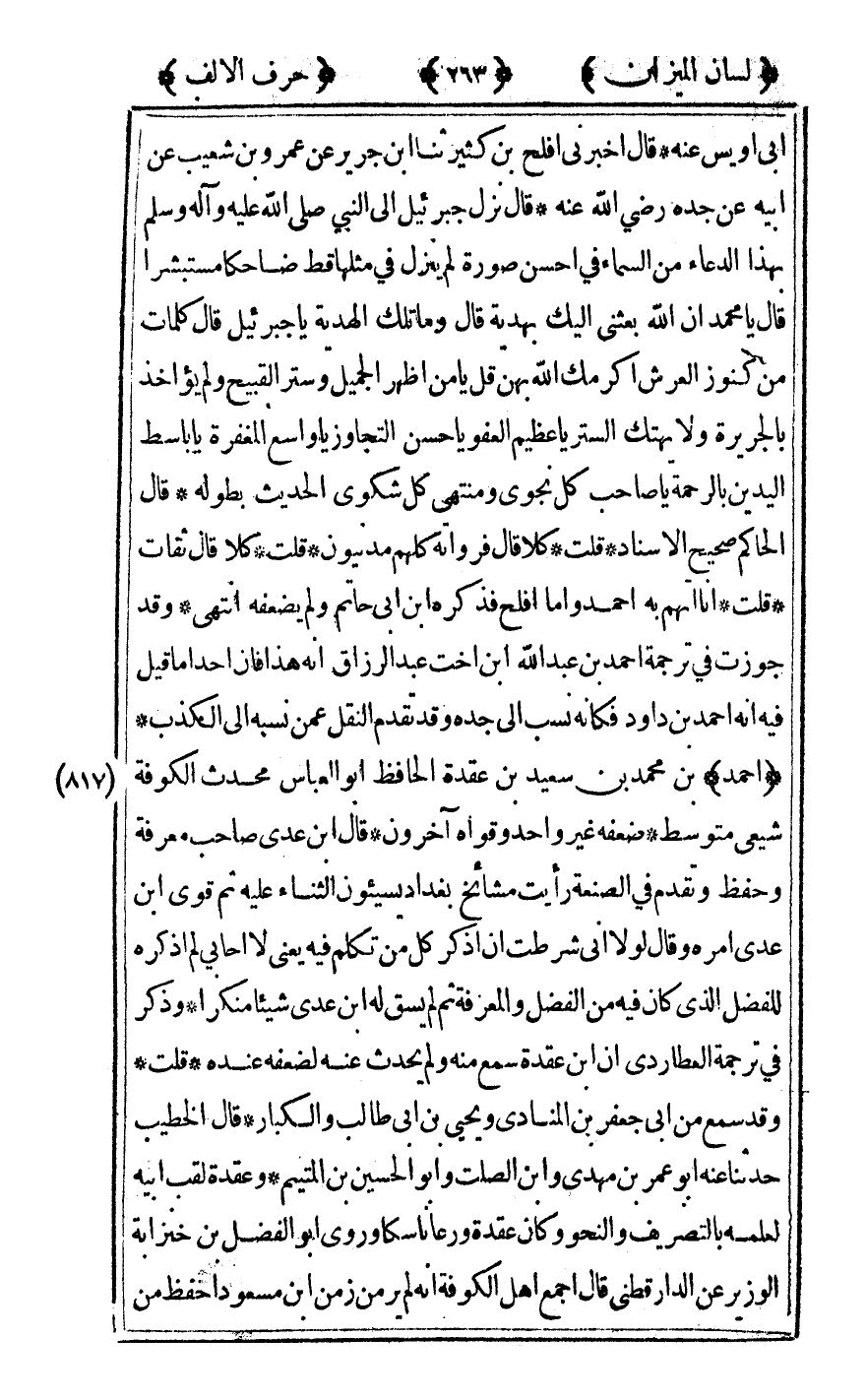 [817] "أحمد" بن محمد بن سعيد بن عقدة الحافظ أبو العباس محدث الكوفة شيعي متوسط ضعفه غير واحد وقواه آخرون قال ابن عدي صاحب معرفة وحفظ وتقدم في الصنعة رأيت مشائخ بغداد يسيئون الثناء عليه ثم قوى بن عدي أمره وقال لولا أني شرطت أن أذكر كل من تكلم فيه يعني لا أحابي لم أذكره للفضل الذي كان فيه من الفضل والمعرفة ثم لم يسق له بن عدي شيئا منكرا وذكر في ترجمة العطاردي أن بن عقدة سمع منه ولم يحدث عنه لضعفه عنده قلت وقد سمع من أبي جعفر بن المنادى ويحيى بن أبي طالب والكبار قال الخطيب حدثنا عنه أبو عمر بن مهدي وابن الصلت وأبو الحسين بن المتيم وعقدة لقب أبيه لعلمه بالتصريف والنحو وكان عقدة ورعا ناسكا وروى أبو الفضل بن خنزابة الوزير عن الدارقطني قال اجمع أهل الكوفة أنه لم ير من زمن بن مسعود احفظ من