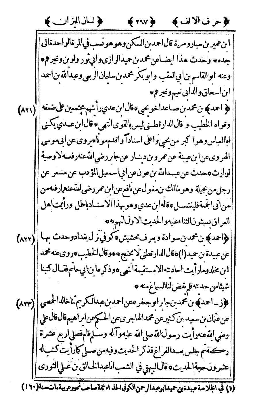 [821] "أحمد" بن محمد بن صاعد أخو يحيى قال ابن عدي رأيتهم مجتمعين على ضعفه وقواه الخطيب وقال الدارقطني ليس بالقوي انتهى قال ابن عدي يكنى أبا العباس وهو أكبر من يحيى وأعلى إسنادا وأقدم موتا يروي عن أبي موسى الهروي عن ابن عيينة عن عمرو بن دينار عن جابر رضى الله تعالى عنه رفعه "لا وصية لوارث" حدث عن عبد الله بن عون عن أبي إسماعيل المؤدب عن مسعر عن رجل من بجيلة وهو مالك بن مغول عن نافع عن ابن عمر رضى الله تعالى عنهما رفعه "من أتى الجمعة فليغتسل" قاله بن عدي وهو بهذا الإسناد باطل ورأيت أهل العراق يسيئون الثناء عليه والحديث الأول اتهم به.