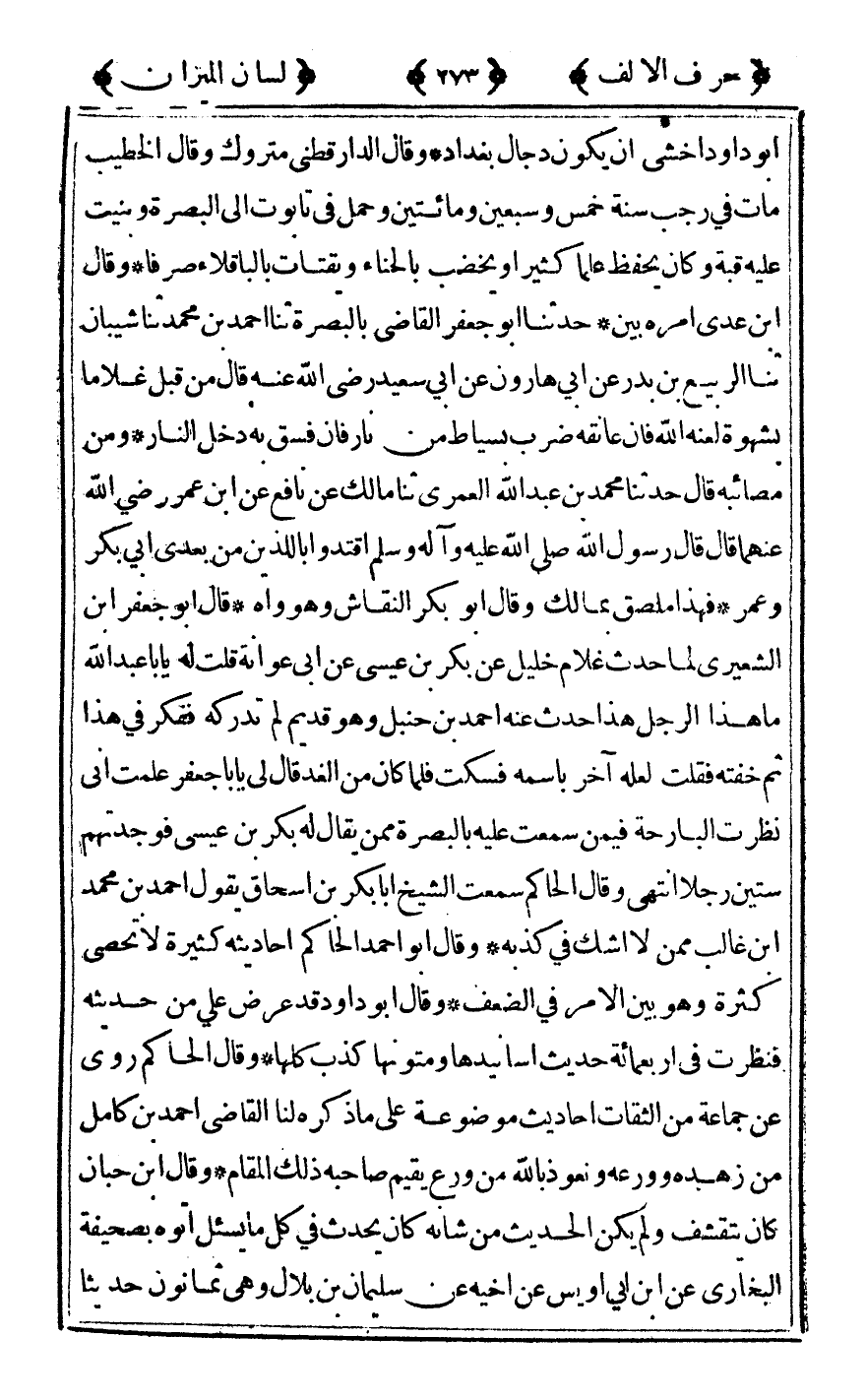 أبو داود أخشى أن يكون دجال بغداد وقال الدارقطني متروك وقال الخطيب مات في رجب سنة خمس وسبعين ومائتين وحمل في تابوت إلى البصرة وبنيت عليه قبة وكان يحفظ علما كثيرا ويخضب بالحناء ويقتات بالباقلاء صرفا وقال ابن عدي امره بين حدثنا أبو جعفر القاضي بالبصرة ثنا أحمد بن محمد ثنا شيبان ثنا الربيع بن بدر عن هارون عن أبي سعيد رضى الله تعالى عنه قال من قبل غلاما بشهوة لعنه الله فإن عانقه ضرب بسياط من نار فإن فسق به دخل النار ومن مصائبه قال حدثنا محمد بن عبد الله العمري ثنا مالك عن نافع عن ابن عمر رضى الله تعالى عنهما قال: قال رسول الله صلى الله عليه وسلم: "اقتدوا بالذين من بعدي أبي بكر وعمر" فهذا ملصق بمالك وقال أبو بكر النقاش وهو واه قال أبو جعفر بن الشعيري لما حدث غلام خليل عن بكر بن عيسى عن أبي عوانة قلت له يا أبا عبد الله ما هذا الرجل هذا حدث عنه أحمد بن حنبل وهو قديم لم تدركه ففكر في هذا ثم خفته فقلت لعله آخر باسمه فسكت فلما كان من الغد قال يا أبا جعفر علمت أني نظرت البارحة فيمن سمعت عليه بالبصرة ممن يقال له بكر بن عيسى فوجدتهم ستين رجلا انتهى وقال الحاكم سمعت الشيخ أبا بكر بن إسحاق يقول أحمد بن محمد بن غالب ممن لا أشك في كذبه وقال أبو أحمد الحاكم أحاديثه كثيرة لا تحصى كثرة وهو بين الأمر في الضعف وقال أبو داود قد عرض علي من حديثه فنظرت في أربعمائة حديث أسانيدها ومتونها كذب كلها وقال الحاكم روى عن جماعة من الثقات أحاديث موضوعة على ما ذكره لنا القاضي أحمد بن كامل من زهده وورعه ونعوذ بالله من ورع يقيم صاحبه ذلك المقام وقال ابن حبان كان يتقشف ولم يكن الحديث من شأنه كان يحدث في كل ما يسئل أتوه بصحيفة البخاري عن ابن أبي أويس عن أخيه عن سليمان بن بلال وهي ثمانون حديثا