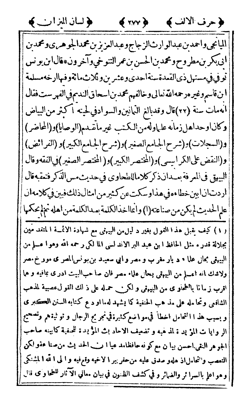 1 كيف يقبل هذا القول بغير دليل من البيهقي مع شهادة الائمة المتقدمين بجلالة قدره مثل الحافظ ابن عبد البر الأندلسي المالكي رحمه الله وهو أعلم من البيهقي بحال علماء ديار مغرب ومصر وأبي سعيد بن يونس المصري مؤرخ مصر ولا شك أنه أعلم من البيهقي بحال علماء مصر فإن صاحب البيت أدرى بما فيه وهما وهما اقرب زمانا بالطحاوي من البيهقي ولكن حمله على ذلك القول عصبية لمذهب الشافعي وتحامله على مذهب الحنفية كما يشهد له ماأودع كتابه السنن الكبرى وبسبب هذا التحامل أخطأ في مواضع كثيرة في تجريح الرجال وتوثيقهم وتصحيح الروايات المؤيدة لمذهبه وتضعيف الأحاديث الؤيدة للحنفية كما بينه صاحب الجوهر النقي أحسن بيان مع كونه حافظا مدعيا ان الحديث من صناعة ولكن التعصب والتحامل أذهله وصدق عليه من حفر بئرا لأخيه وقع فيه وإلى الله المشتكى وهو أعلم بالسرائر والضمائر وفي كشف الظنون في بيان معاني الآثار للطحاوي قال الاتقاني في صوم الهداية لامعنى لإنكارهم على أبي جعفر لأنه مؤتمن لا متهم مع غزارة علمه واجتهاده وورعه وتقدمه في معرفة المذاهب وغيرها فإنكارهم عليه بعد تأخر زمانهم بكثير لايجدي نفعا فإن شككت في أمر أبي جعفر فانظر في كتاب شرح معاني الآثار هل ترى له نظيرا في سائر المذاهب فضلا عن مذهبنا هذا – ثم نقل مقال البيهقي في كتاب المعرفة في شأن أبي جعفر وقال هذا لعمري تحامل ظاهر من هذا الإمام البيهقي في شأن هذا الأستاذ الطحاوي الذي اعتمده أكابر المشايخ انتهى ملخصا 12 الحسن النعماني المصحح كان الله له.